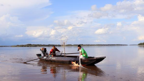 渔民在江上捕捞“头鱼”。(图片来源:中新网)