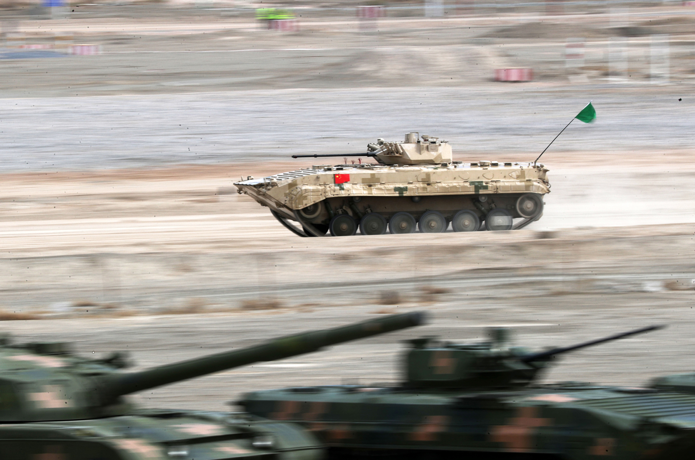 图为8月21日,中国参赛队伍在“国际军事比赛-2022”中国库尔勒赛区进行“苏沃洛夫突击”项目接力赛。(图片来源:中新社)