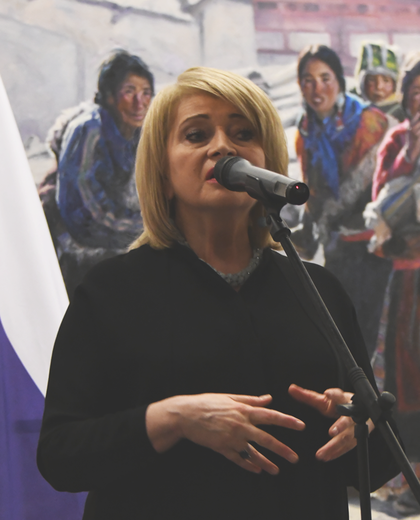 中国驻圣彼得堡总领事王文丽,逐幅仔细观赏了韩玉臣作品,然后在开幕式致辞中说:“中国有56个民族,藏族是保留自己文化风俗最独特的一个。我去过3次西藏,那里的壮美山川和独特风情让我感动。韩玉臣用自己的画笔,用自己的心和感悟,把西藏的大美带给了俄罗斯人民。圣彼得堡是俄罗斯文化之都,俄罗斯国家博物馆本民族作品收藏最丰富,在世界艺坛也享有盛誉。感谢阿拉·玛尼洛娃馆长,为中国艺术家提供了这么好的场所。”