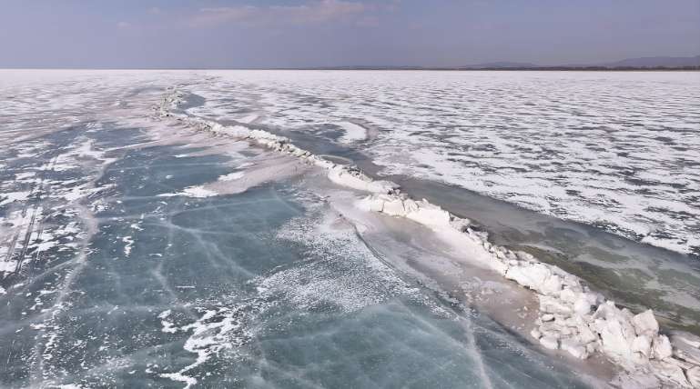 随着气温回升,兴凯湖12日结束了冬捕期,冰层断裂、融化速度加快。