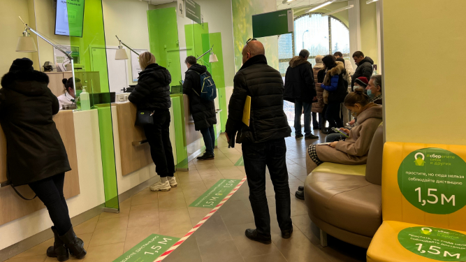 图为3月1日,顾客在莫斯科一家银行营业大厅内等候办理业务。(图片来源:中新社)