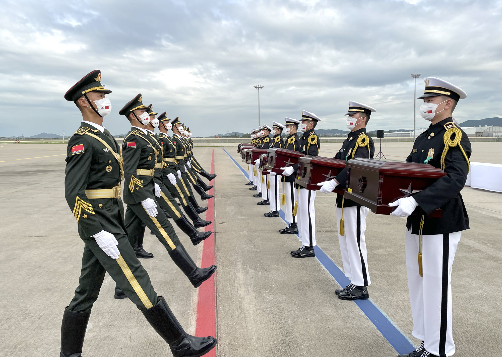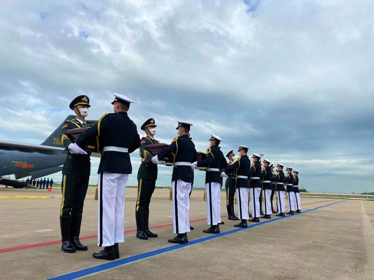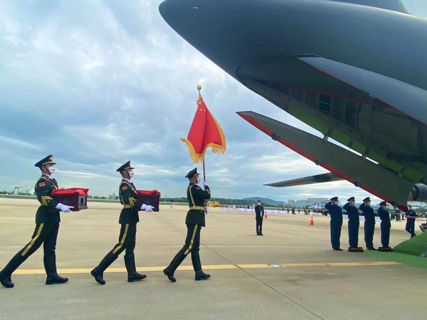 图为中方礼兵护送中国人民志愿军烈士遗骸上飞机。(图片来源:中新社)