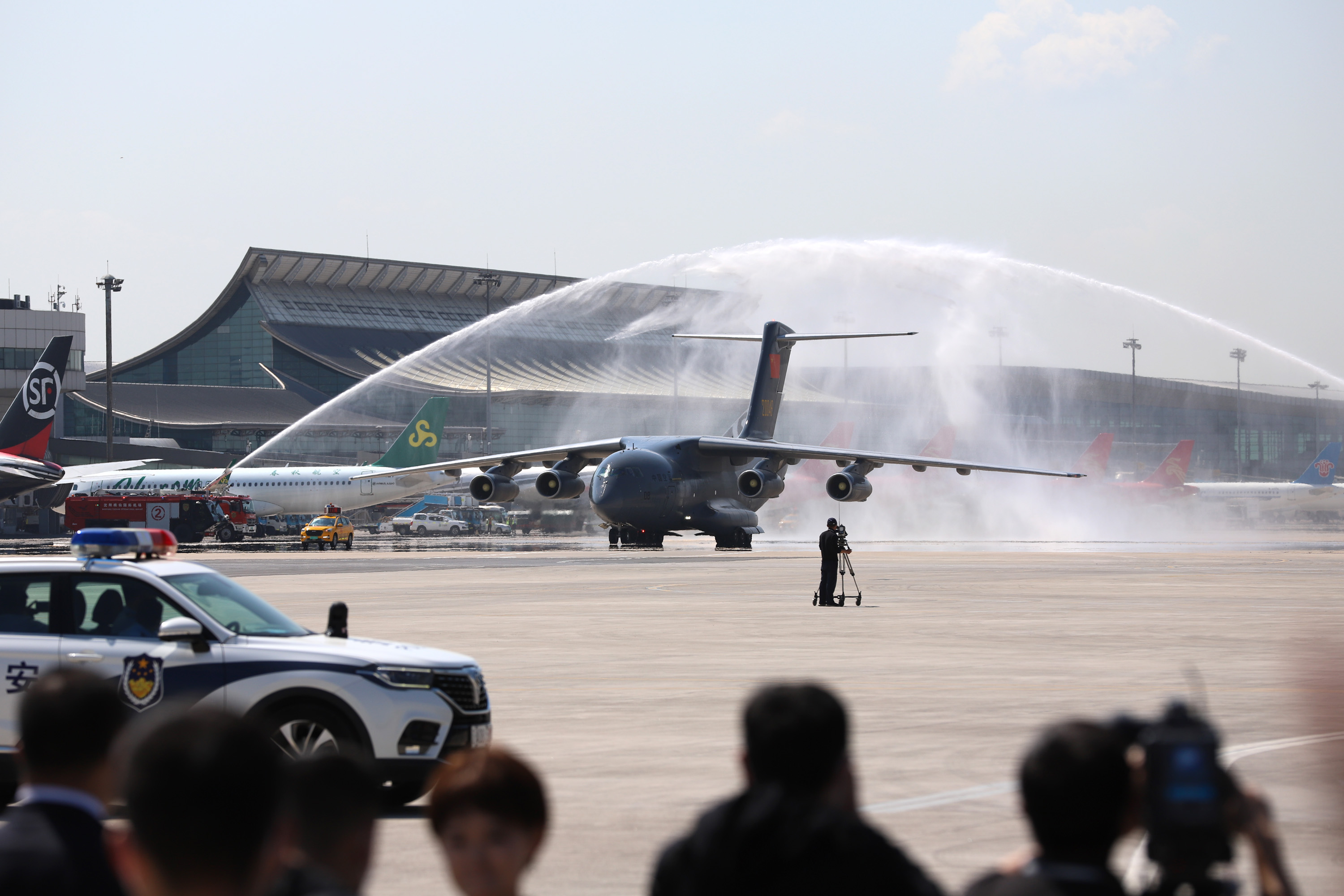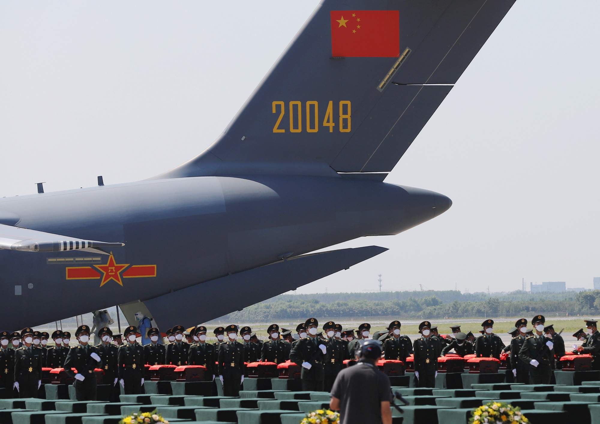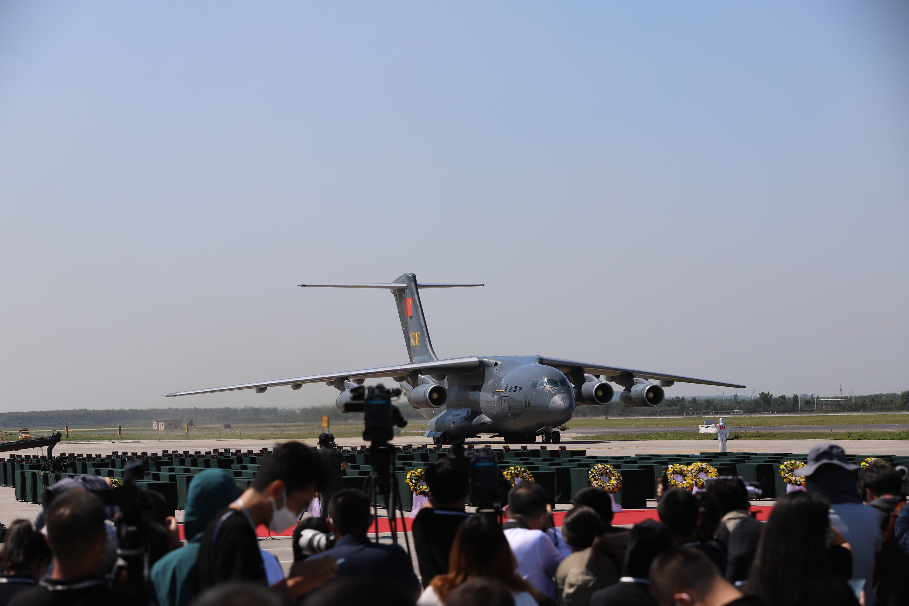 图为当日11时26分许,搭载第八批在韩中国人民志愿军烈士遗骸的中国空军运-20专机抵达沈阳桃仙国际机场。(图片来源:中新社)