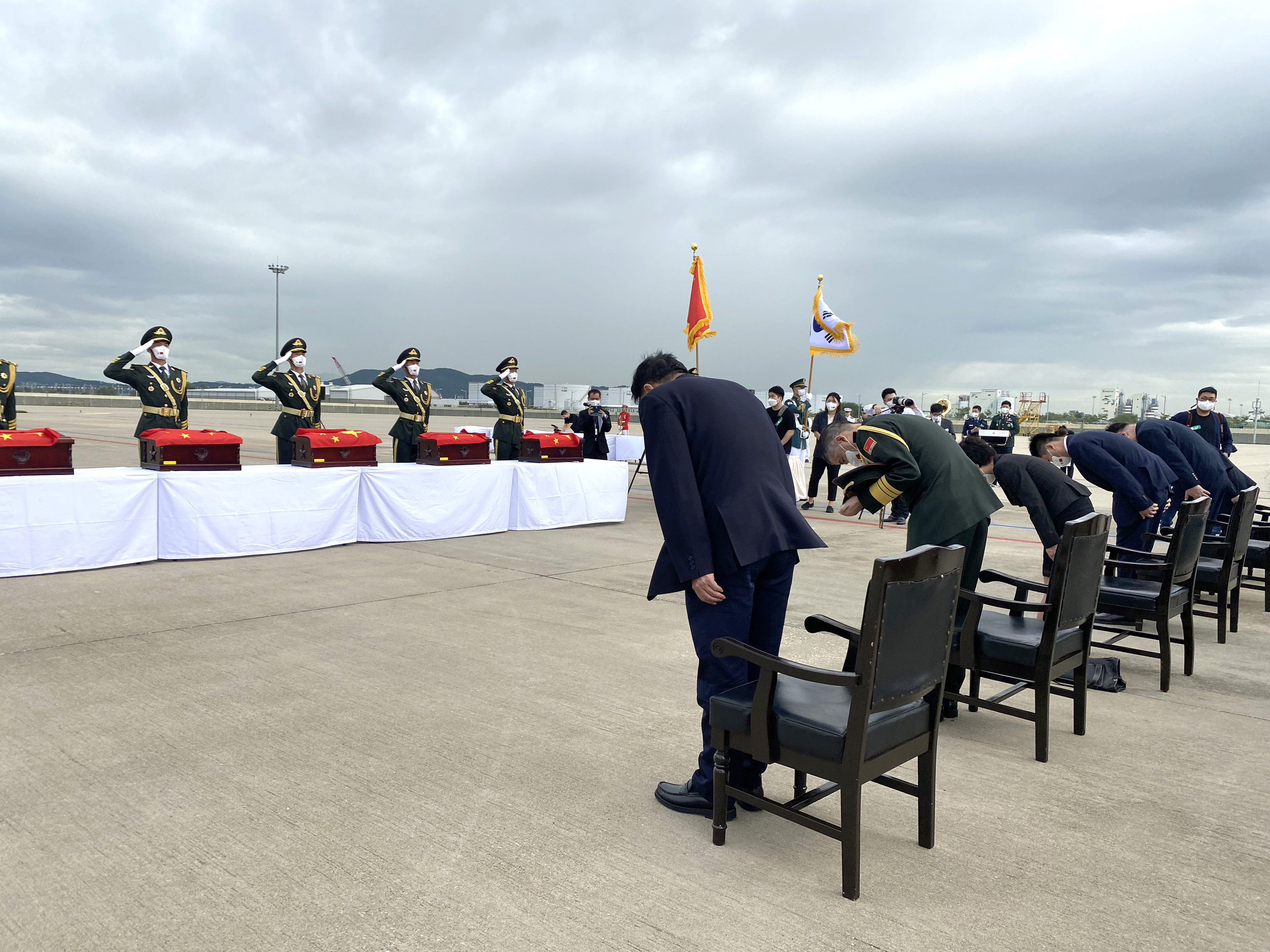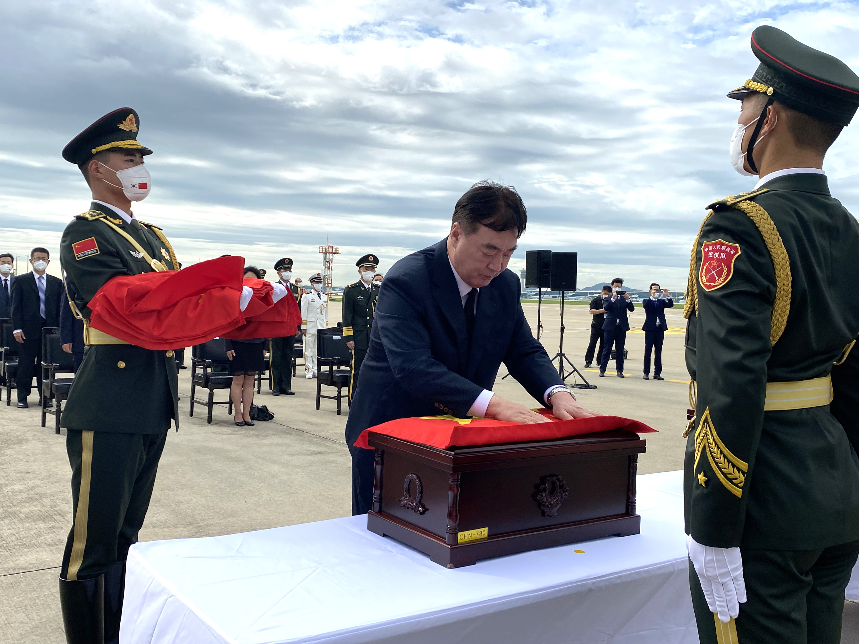 图为中国驻韩国大使邢海明(中)为志愿军烈士棺椁覆盖国旗。(图片来源:中新社)