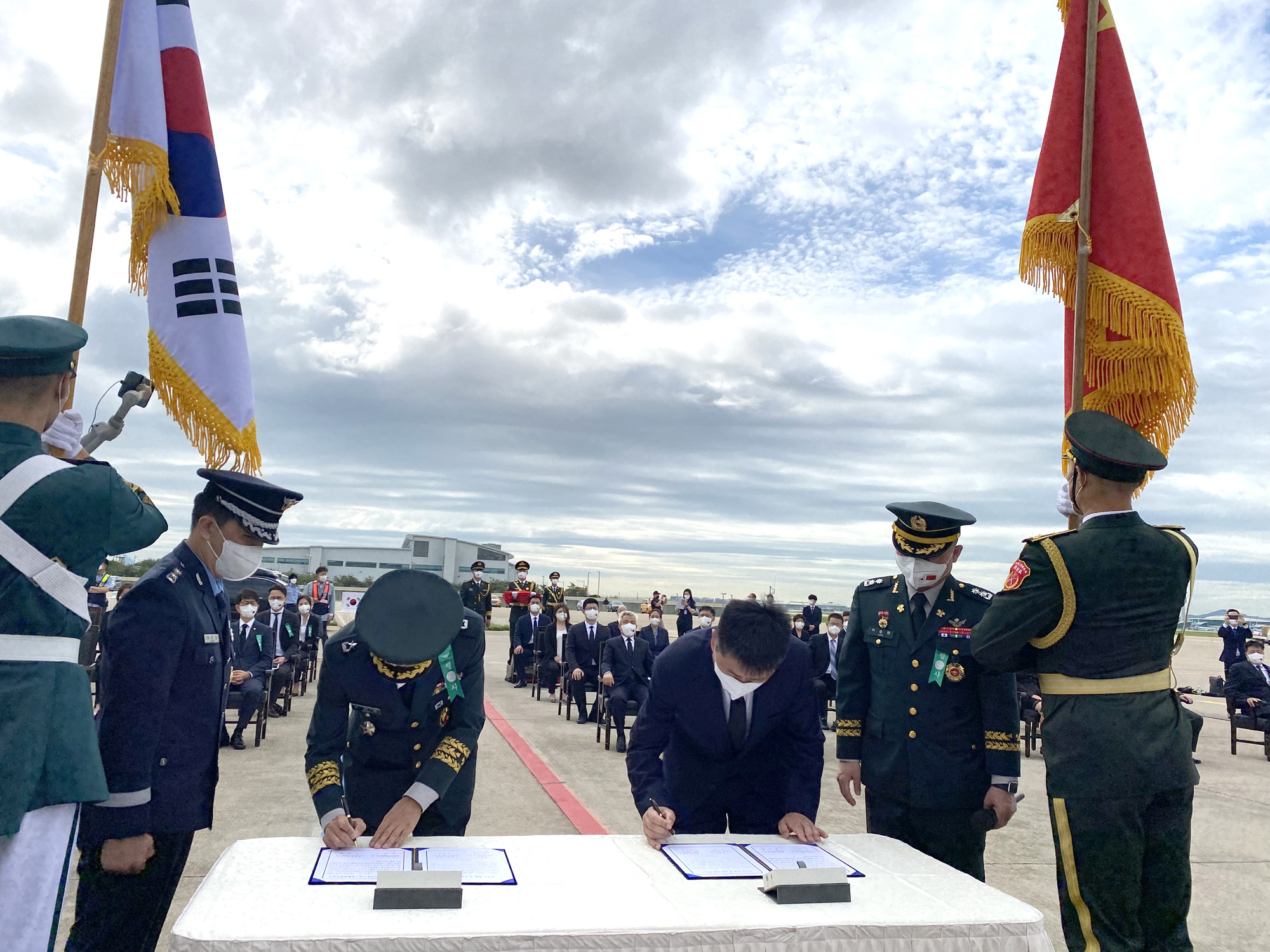 当地时间9月2日上午,第八批在韩中国人民志愿军烈士遗骸交接仪式在韩国仁川国际机场举行。图为中韩双方代表现场签署交接书。(图片来源:中新社)
