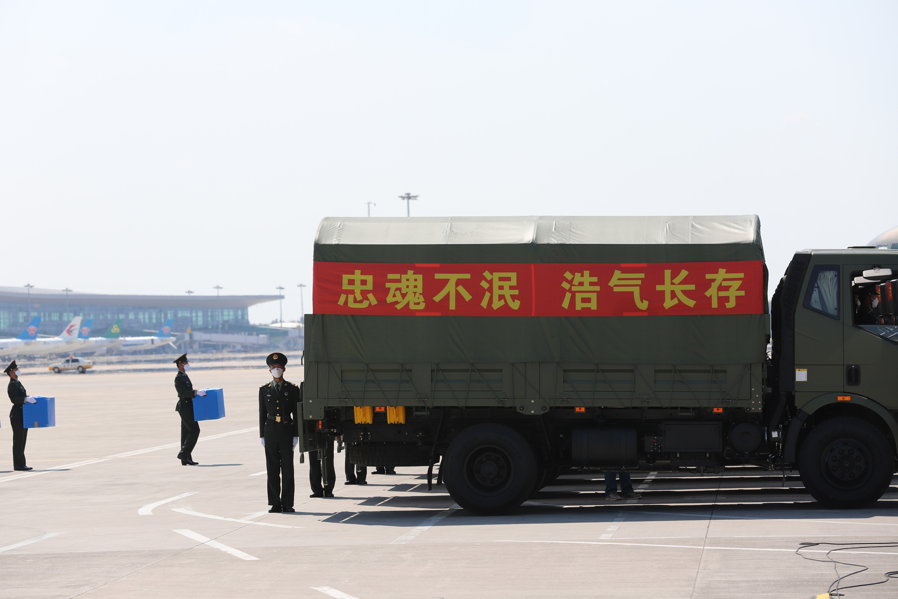 机上共载有109具志愿军烈士遗骸和1226件相关遗物。图为护送烈士遗骸棺椁的军用卡车上写着“忠魂不泯浩气长存”。(图片来源:中新社)