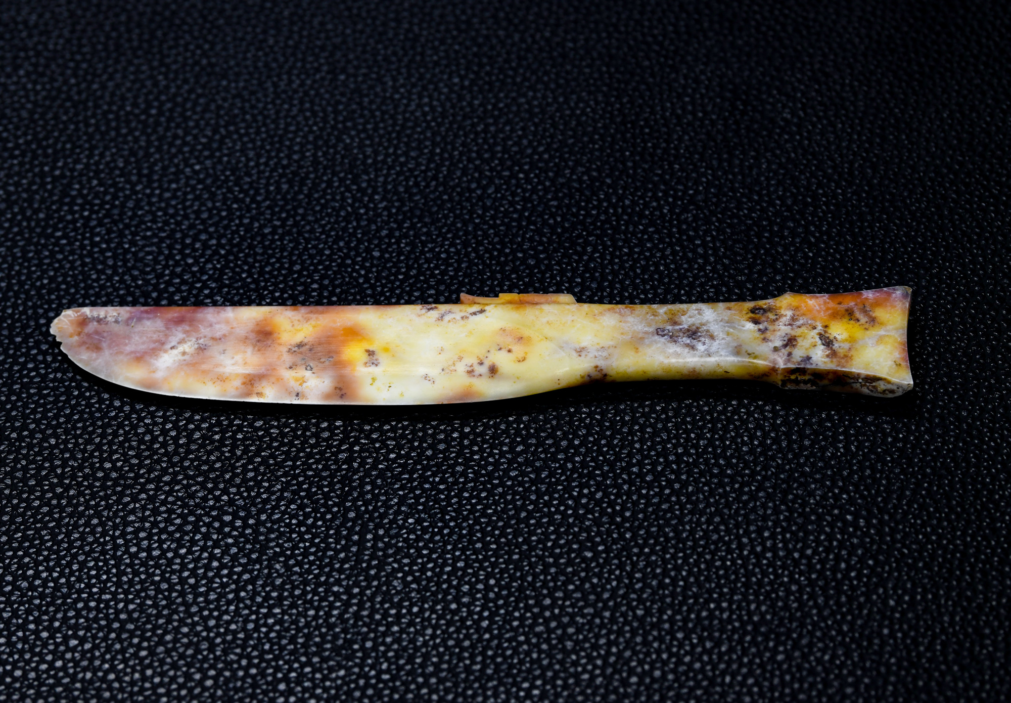 图为在四川省文物考古研究院三星堆考古研究所拍摄的三星堆遗址6号“祭祀坑”出土的玉刀。(图片来源:新华社)