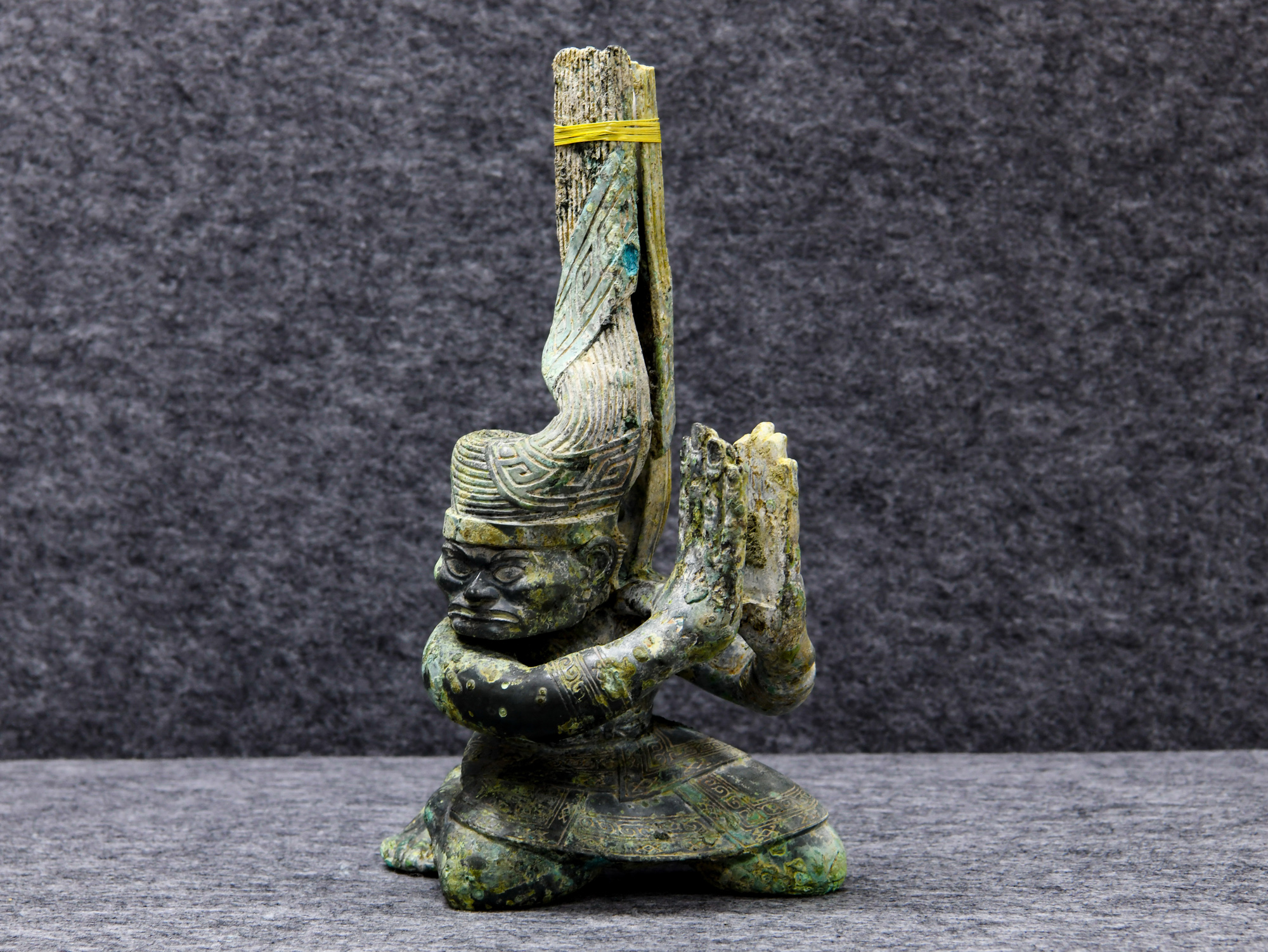 图为在四川省文物考古研究院三星堆考古研究所拍摄的三星堆遗址4号“祭祀坑”出土的铜扭头跪坐人像。(图片来源:新华社)