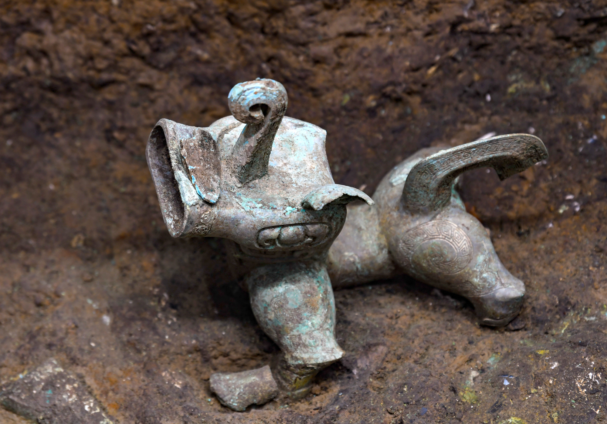 图为在四川德阳广汉市三星堆遗址考古发掘现场8号“祭祀坑”拍摄的青铜神兽。(图片来源:新华社)