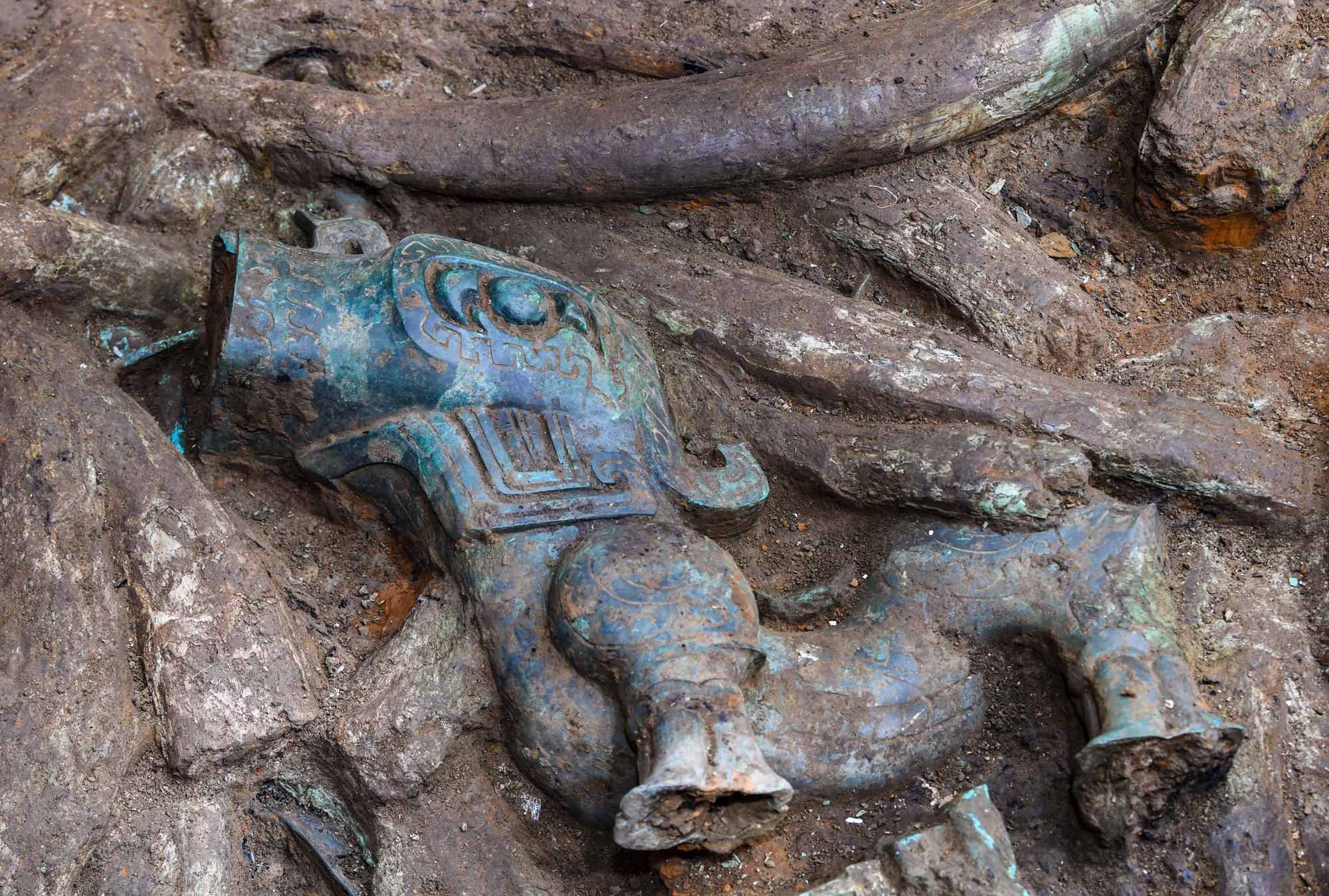 据了解,目前3号“祭祀坑”发掘已近尾声,4号“祭祀坑”发掘已经结束,5、6号“祭祀坑”因面积较小、深度较浅,将被提取到实验室“解剖”,7、8号“祭祀坑”刚刚到文物层,大中型青铜器、象牙、玉石器等铺满了整个“祭祀坑”,犬牙交错、层层叠叠,令人叹为观止。图为三星堆遗址3号“祭祀坑”出土的青铜器盖。(图片来源:新华社)