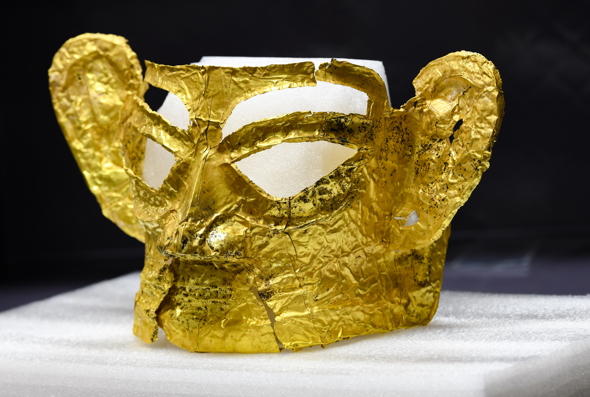 图为在四川省文物考古研究院三星堆考古研究所拍摄的三星堆遗址3号“祭祀坑”出土的金面具。(图片来源:新华社)