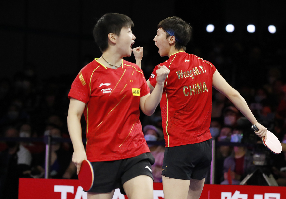 当地时间11月29日,孙颖莎(左)和王曼昱在比赛中。当日,在美国休斯敦举行的2021世界乒乓球锦标赛女子双打决赛中,中国组合孙颖莎/王曼昱战胜日本组合伊藤美诚/早田希娜,夺得冠军。(图片来源:中新社)