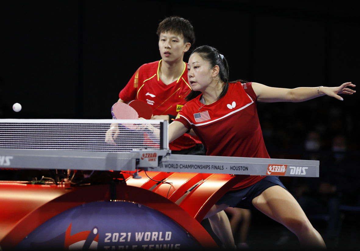 当地时间11月28日,林高远(左)和张安在比赛中。当日,在美国休斯敦举行的2021世界乒乓球锦标赛混合双打半决赛中,中美跨国组合林高远(中国)/张安(美国)负于日本组合张本智和/早田希娜,获得一枚铜牌。(图片来源:中新社)