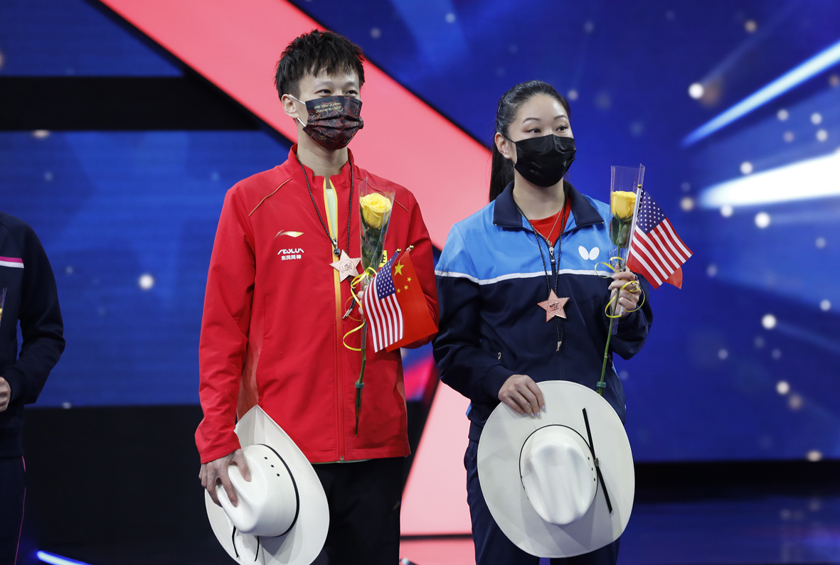 当地时间11月28日,林高远(左)和张安参加休斯敦世乒赛混双项目的颁奖仪式。当日,在美国休斯敦举行的2021世界乒乓球锦标赛混合双打半决赛中,中美跨国组合林高远(中国)/张安(美国)负于日本组合张本智和/早田希娜,获得一枚铜牌。(图片来源:中新社)