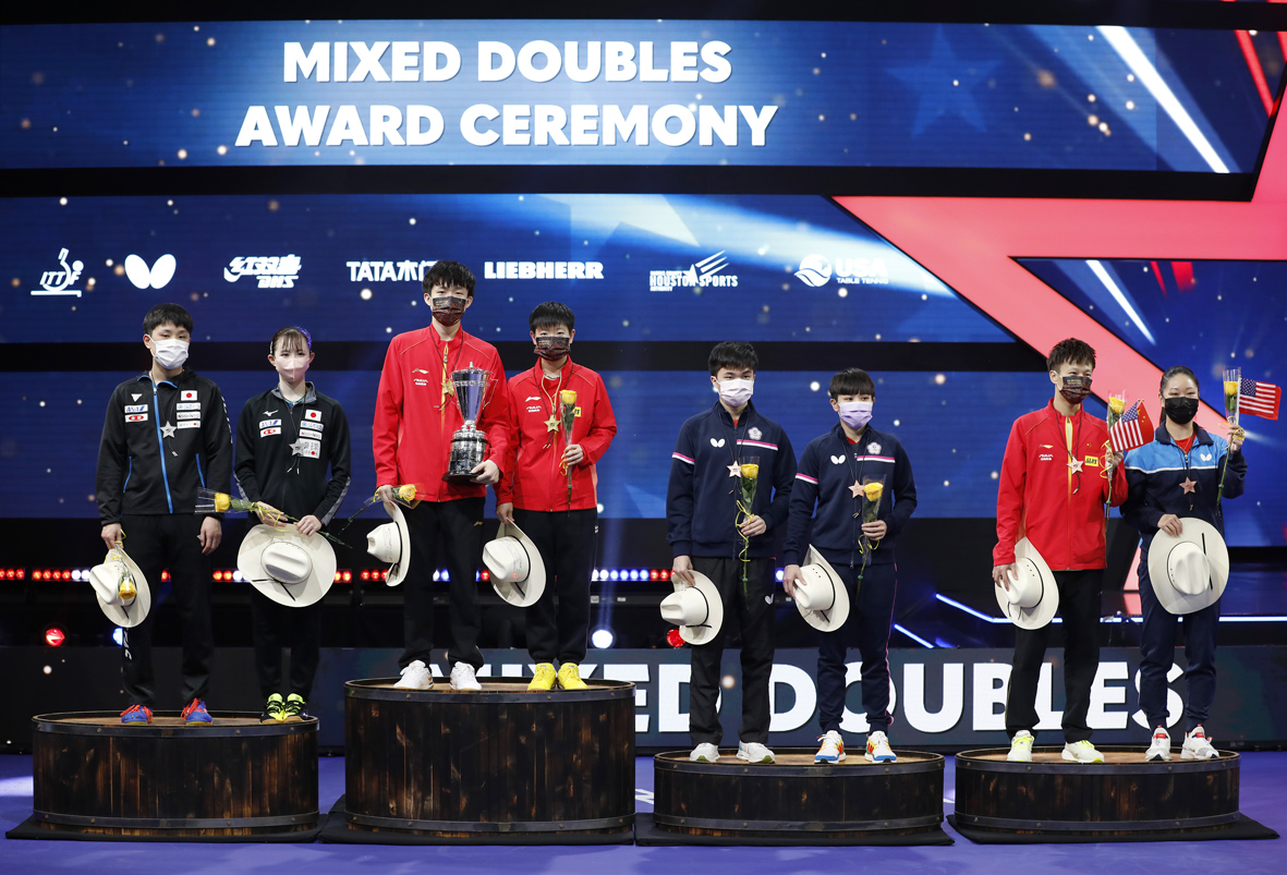 当地时间11月28日,王楚钦(左三)和孙颖莎(左四)参加休斯敦世乒赛混双项目的颁奖仪式。当日,在美国休斯敦举行的2021世界乒乓球锦标赛混合双打决赛中,中国组合王楚钦/孙颖莎战胜日本组合张本智和/早田希娜,夺得冠军。(图片来源:中新社)