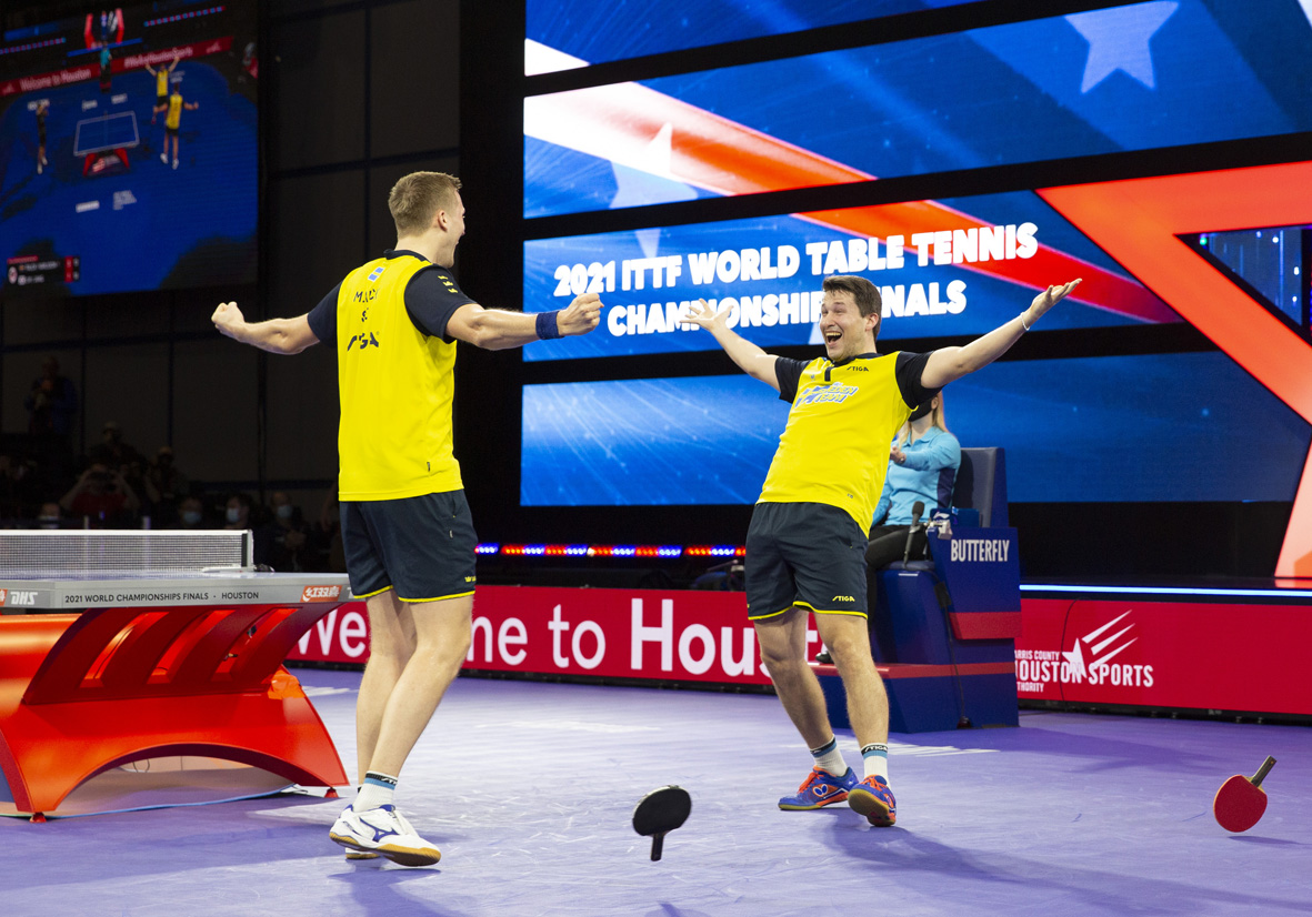 当地时间11月29日,瑞典组合法尔克(左)和卡尔松在休斯敦世乒赛男子双打决赛中庆祝胜利。当日,在美国休斯敦举行的2021世界乒乓球锦标赛男子双打决赛中,瑞典组合法尔克/卡尔松战胜韩国组合张禹珍/林钟勋,获得冠军。(图片来源:中新社)