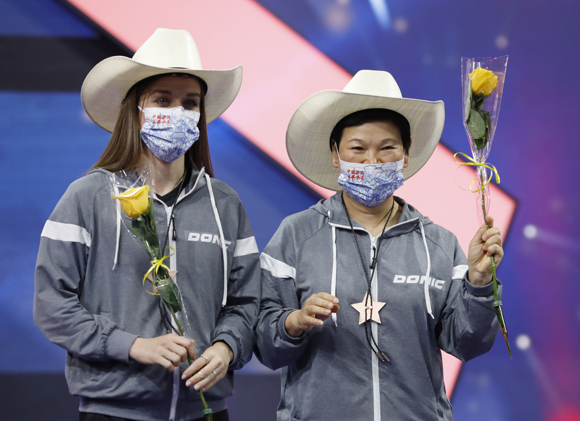 当地时间11月29日,58岁的倪夏莲(右)和德努特参加休斯敦世乒赛女双项目的颁奖仪式。28日,在美国休斯敦举行的2021世界乒乓球锦标赛女子双打半决赛中,卢森堡组合倪夏莲/德努特负于中国组合孙颖莎/王曼昱,收获一枚铜牌。(图片来源:中新社)
