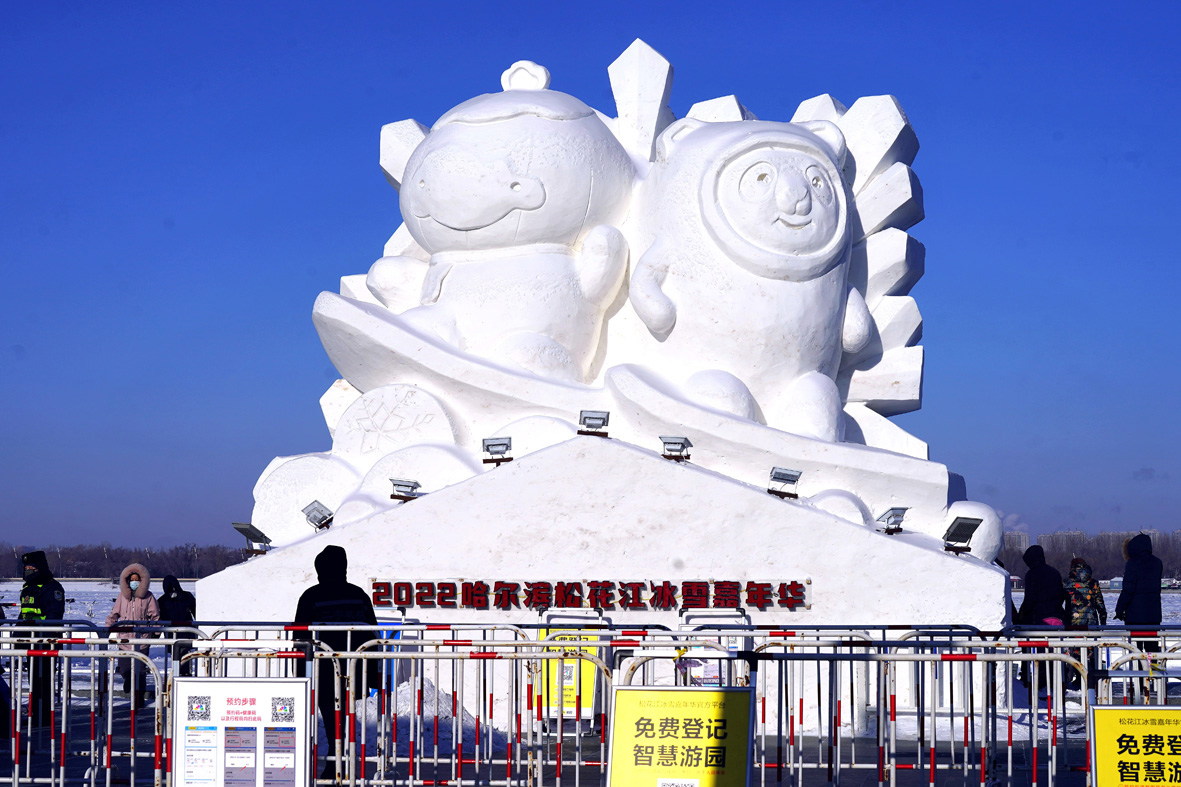 1月2日,黑龙江哈尔滨,“冰墩墩”和“雪容融”雪雕吸引游客。近日,以北京冬奥会为主题的冰雕、雪雕亮相哈尔滨中央大街和防洪纪念塔广场。 (图片来源:中新社)