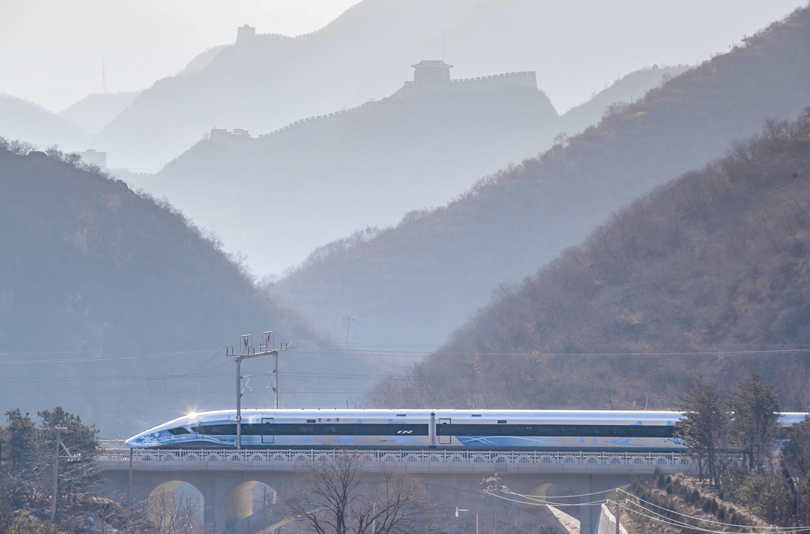 1月6日,列车从北京居庸关长城旁驶过。当日,奥运版复兴号智能动车组在京张高铁上线开行。该动车组编组8辆,定员564人,设商务、一等、二等、媒体车厢;外观采用“瑞雪迎春”涂装方案,整体颜色中点缀若隐若现的雪花和运动元素,彰显冬奥主题。新车型为北京冬奥会量身定制,在自动驾驶、5G超高清演播室等方面走在世界前列。 (图片来源:中新社)