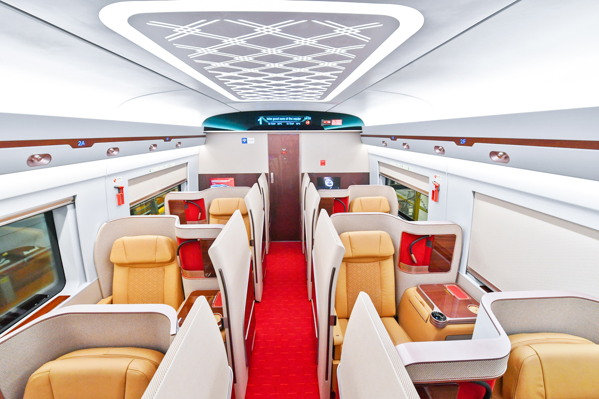 1月6日,奥运版复兴号智能动车组在京张高铁上线开行。该动车组编组8辆,定员564人,设商务、一等、二等、媒体车厢;外观采用“瑞雪迎春”涂装方案,整体颜色中点缀若隐若现的雪花和运动元素,彰显冬奥主题。图为商务座车厢内景。 (图片来源:中新社)