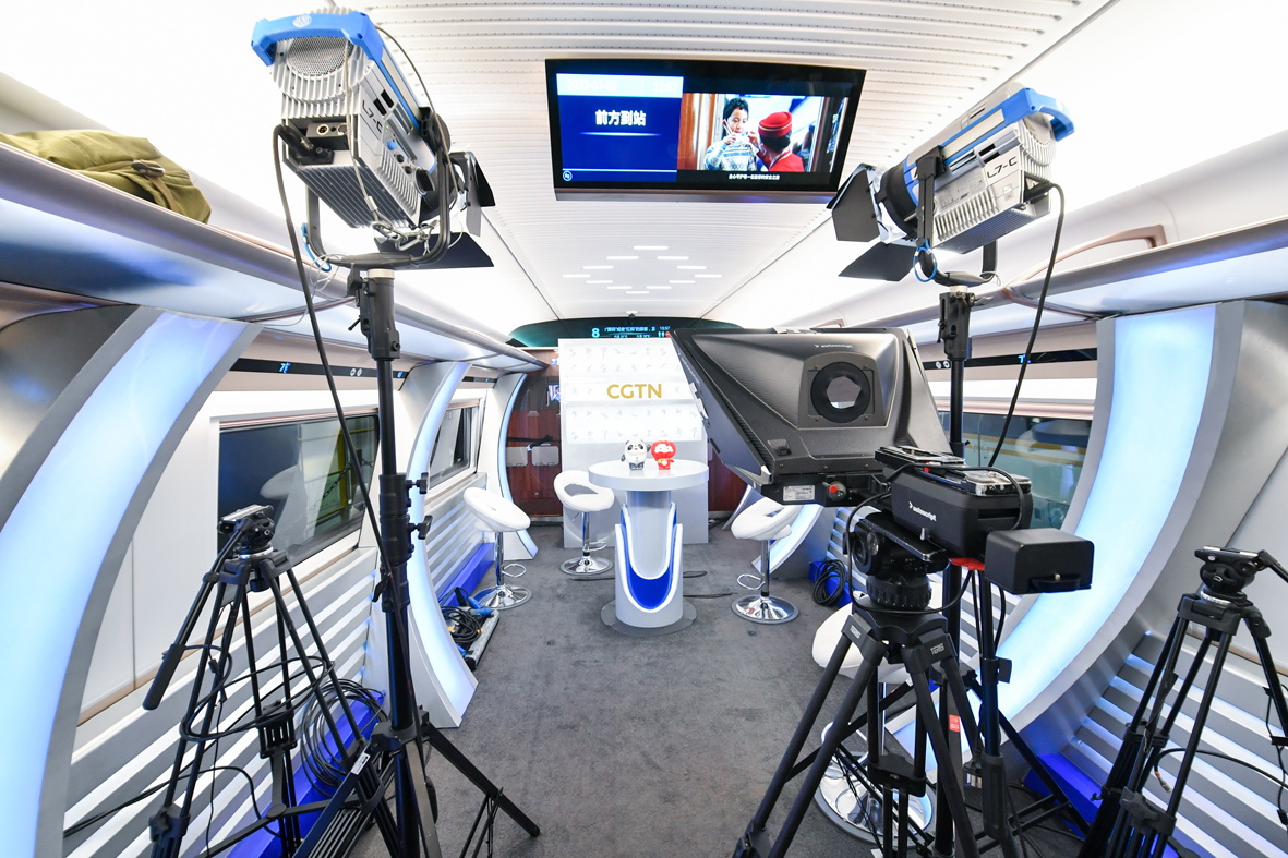 图为1月5日拍摄的车厢内5G超高清演播室。 (图片来源:中新社)