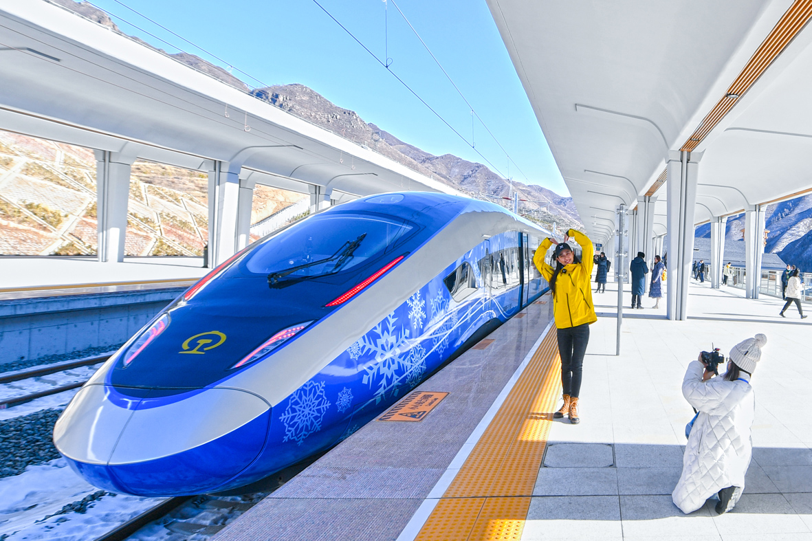 1月6日,奥运版复兴号智能动车组在京张高铁上线开行。该动车组编组8辆,定员564人,设商务、一等、二等、媒体车厢;外观采用“瑞雪迎春”涂装方案,整体颜色中点缀若隐若现的雪花和运动元素,彰显冬奥主题。图为列车停靠在崇礼站。 (图片来源:中新社)
