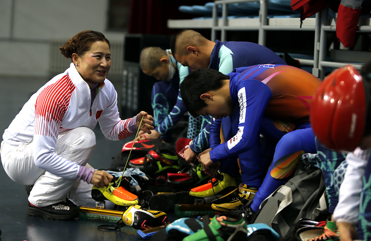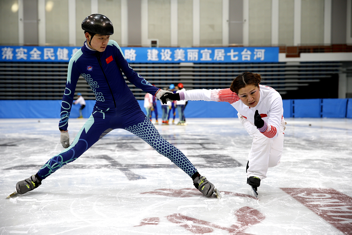 张杰(右)指导“特奥宝贝”滑冰技巧。张杰是一名短道速滑世界冠军,也是七台河市特殊教育学校特奥短道速滑队发起人兼公益教练员。她培养的残障孩子里,有的成为了特奥会世界冠军,有的当上了速滑助教。由于张杰无微不至的关心和教导,孩子们亲切地称她为“教练妈妈”。(图片来源:中新社)