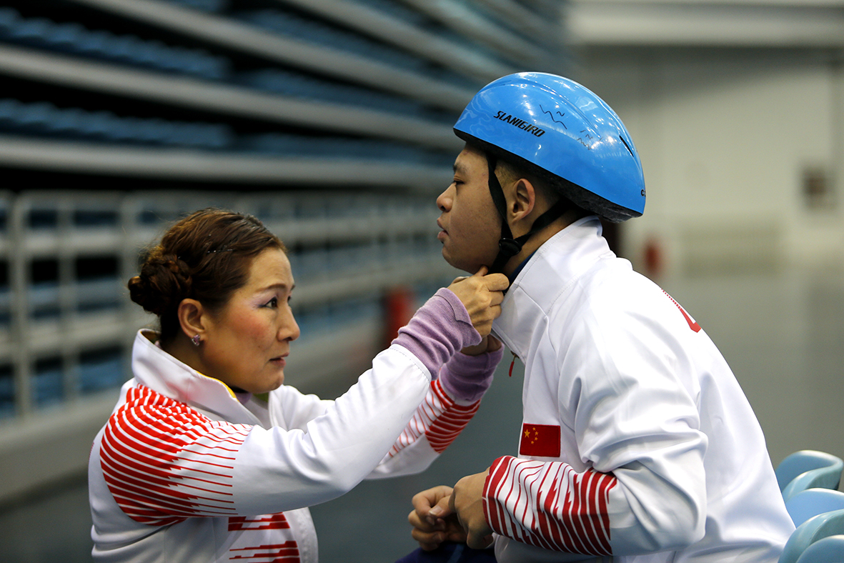 张杰(左)帮“特奥宝贝”调整头盔。(图片来源:中新社)