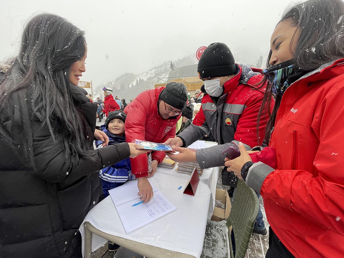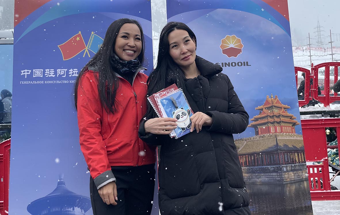 当地时间1月29日,中国驻阿拉木图总领馆联合驻哈中资企业在哈萨克斯坦阿拉木图琼布拉克滑雪场举办“雪场庆冬奥”活动,并向当地民众发放北京冬奥会纪念品。(图片来源:中新社)