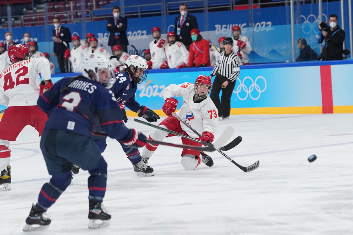 2月5日,北京2022年冬奥会女子冰球小组赛在五棵松体育中心举行,美国队(白色头盔)对阵俄罗斯奥委会队。 (图片来源:中新社)
