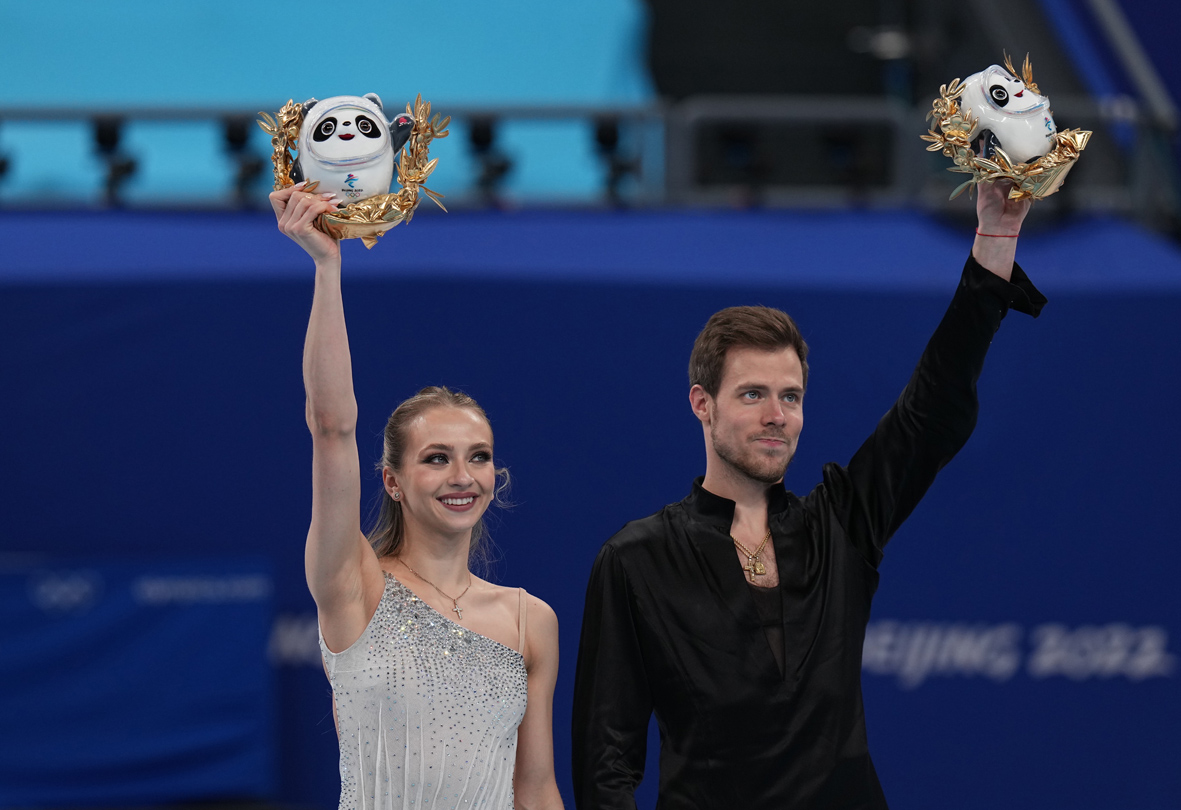 2月14日,北京2022年冬奥会花样滑冰冰上舞蹈自由舞比赛在首都体育馆举行。俄罗斯奥委会选手维多利亚·西尼齐娜/尼基塔·卡察拉波夫获得亚军。图为维多利亚·西尼齐娜(左)/尼基塔·卡察拉波夫在比赛后庆祝。(图片来源:中新社)