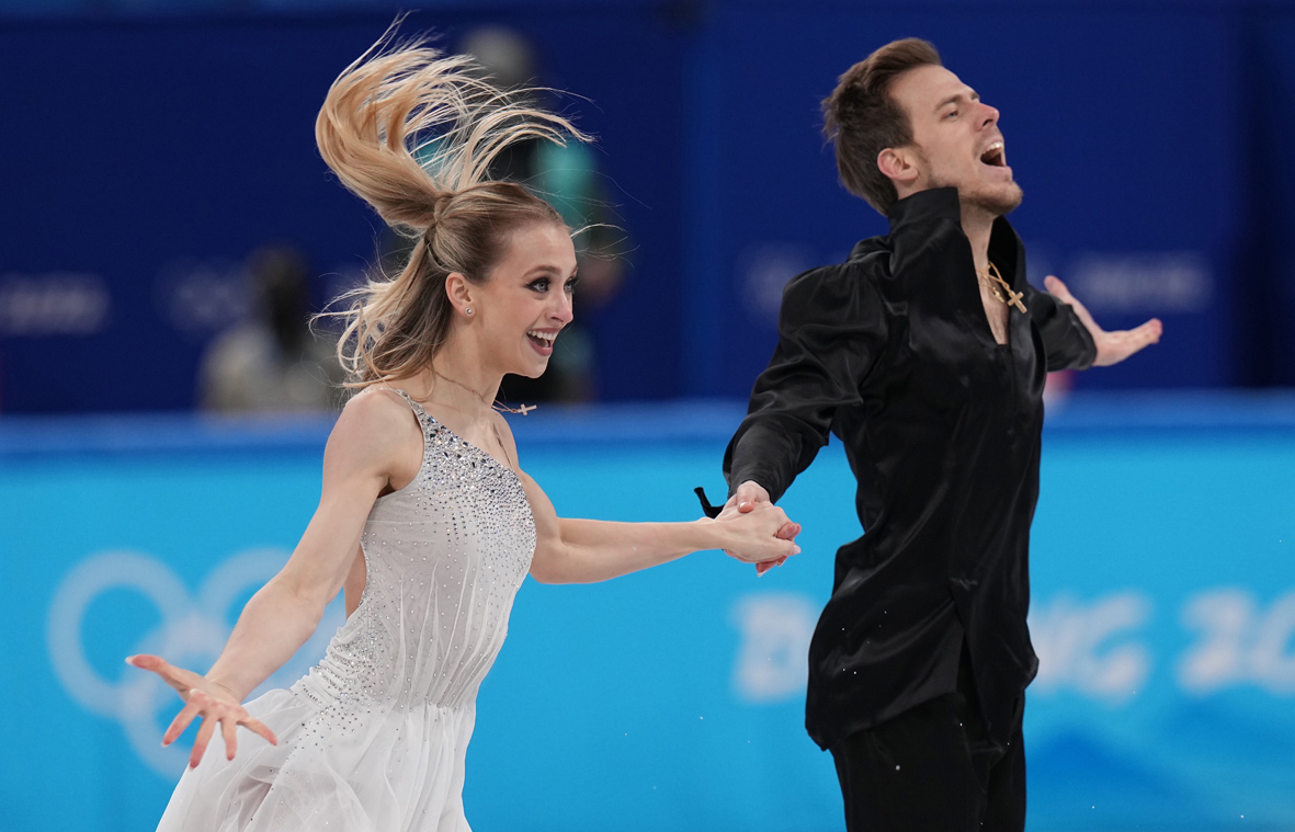 2月14日,北京2022年冬奥会花样滑冰冰上舞蹈自由舞比赛在首都体育馆举行。俄罗斯奥委会选手维多利亚·西尼齐娜/尼基塔·卡察拉波夫获得亚军。图为维多利亚·西尼齐娜(右)/尼基塔·卡察拉波夫在比赛中。(图片来源:中新社)