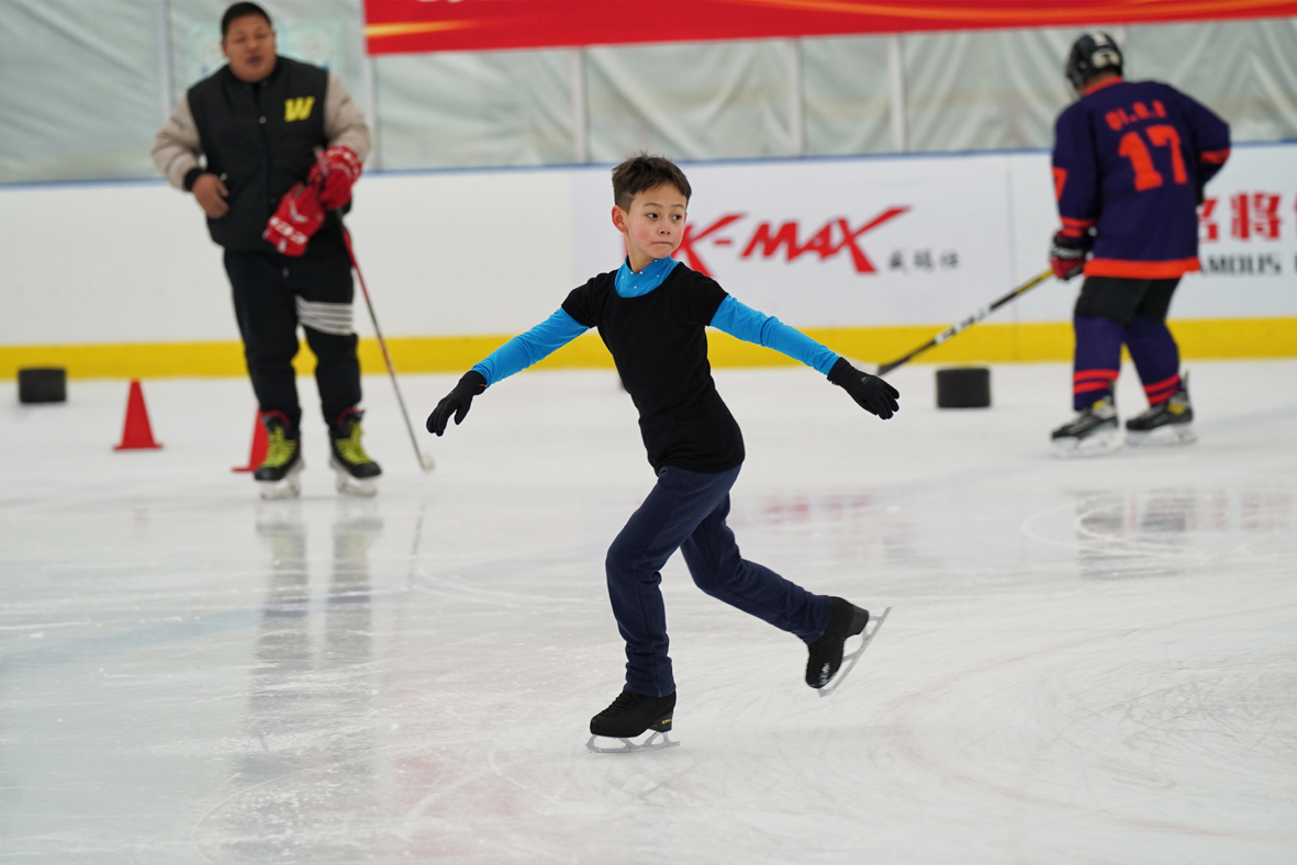 2月22日,黑龙江哈尔滨,青少年练习花样滑冰技巧。北京2022年冬奥会虽然已闭幕,但哈尔滨青少年们对于滑冰的热情依旧高涨。(图片来源:中新社)