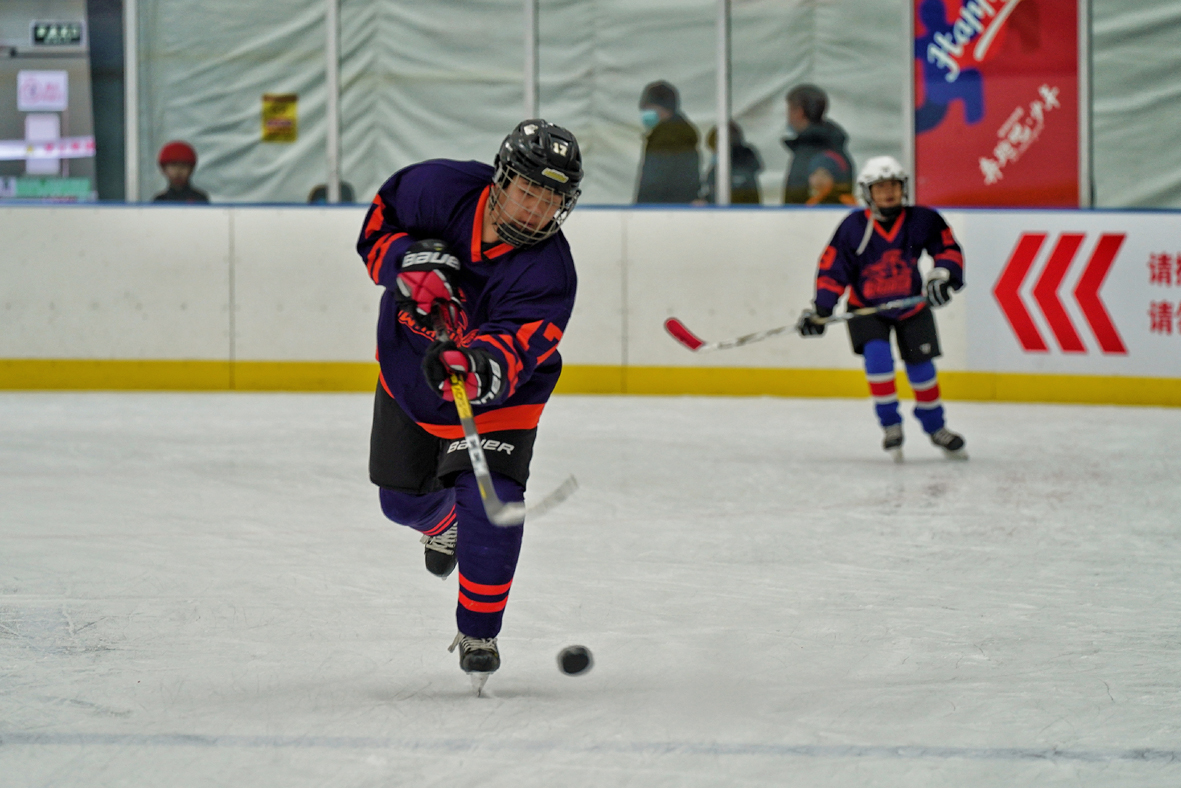 2月22日,黑龙江哈尔滨,两名青少年打冰球。北京2022年冬奥会虽然已闭幕,但哈尔滨青少年们对于滑冰的热情依旧高涨。(图片来源:中新社)