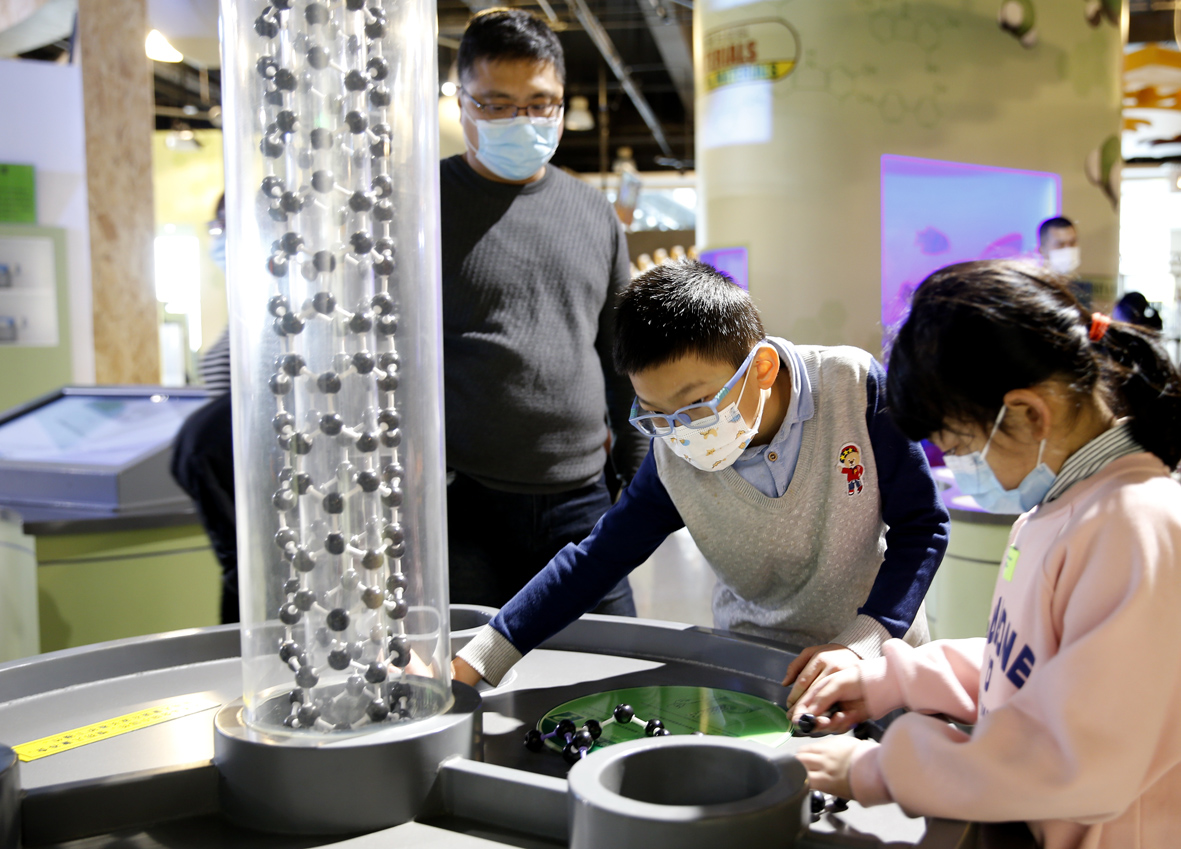 2月26日,黑龙江哈尔滨,家长和孩子观看纳米材料内部构造仿真科技模型。(图片来源:中新社)