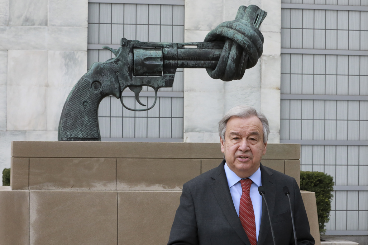 当地时间4月19日,联合国秘书长古特雷斯在纽约联合国总部《打结的手枪》雕塑前召开记者会,呼吁俄罗斯和乌克兰实施为期4天的东正教复活节人道主义暂时停火,以便开放一系列人道主义走廊。(图片来源:中新社)
