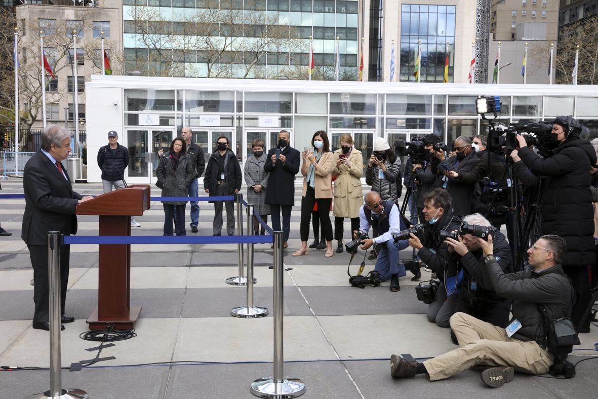 当地时间4月19日,联合国秘书长古特雷斯在纽约联合国总部《打结的手枪》雕塑前召开记者会,呼吁俄罗斯和乌克兰实施为期4天的东正教复活节人道主义暂时停火,以便开放一系列人道主义走廊。 (图片来源:中新社)