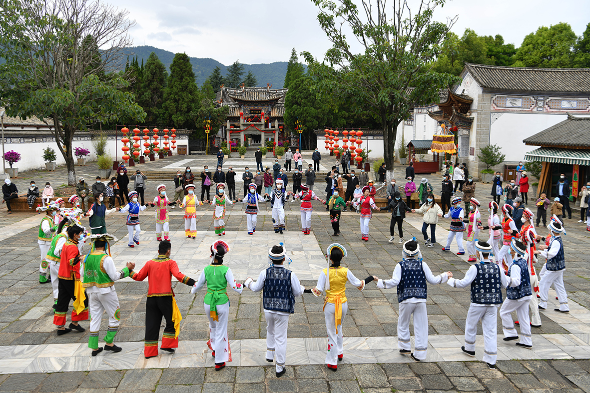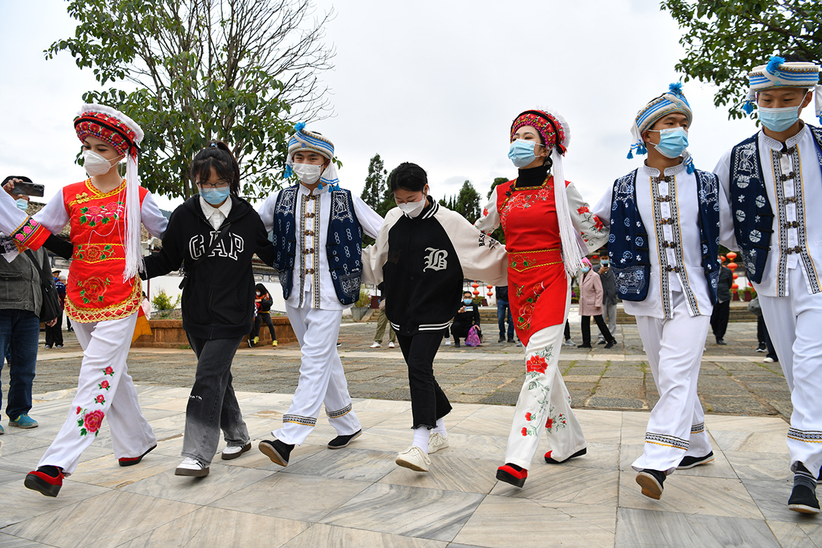 5月2日,白族民众和游客一起载歌载舞。(图片来源:中新社)