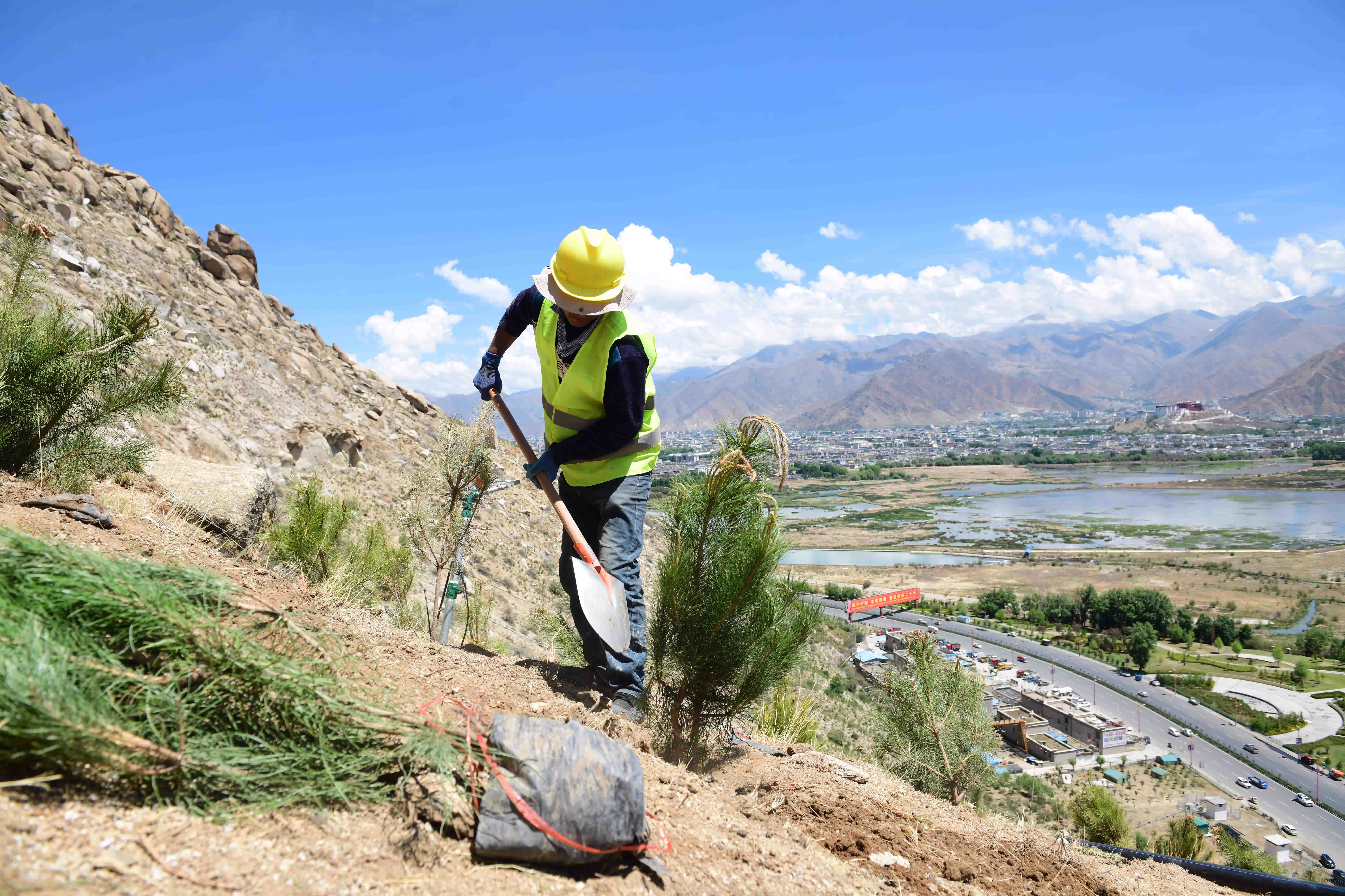 5月16日,西藏拉萨南北山绿化工程北山片区,造林队员在栽植樟子松苗。据悉,预计到2030年,拉萨南北山绿化工程将完成营造林206.7万亩,其中人工造林120.6万亩,封山育林育草(含飞播造林)83.9万亩,森林提质增效2.2万亩。(图片来源:中新社)