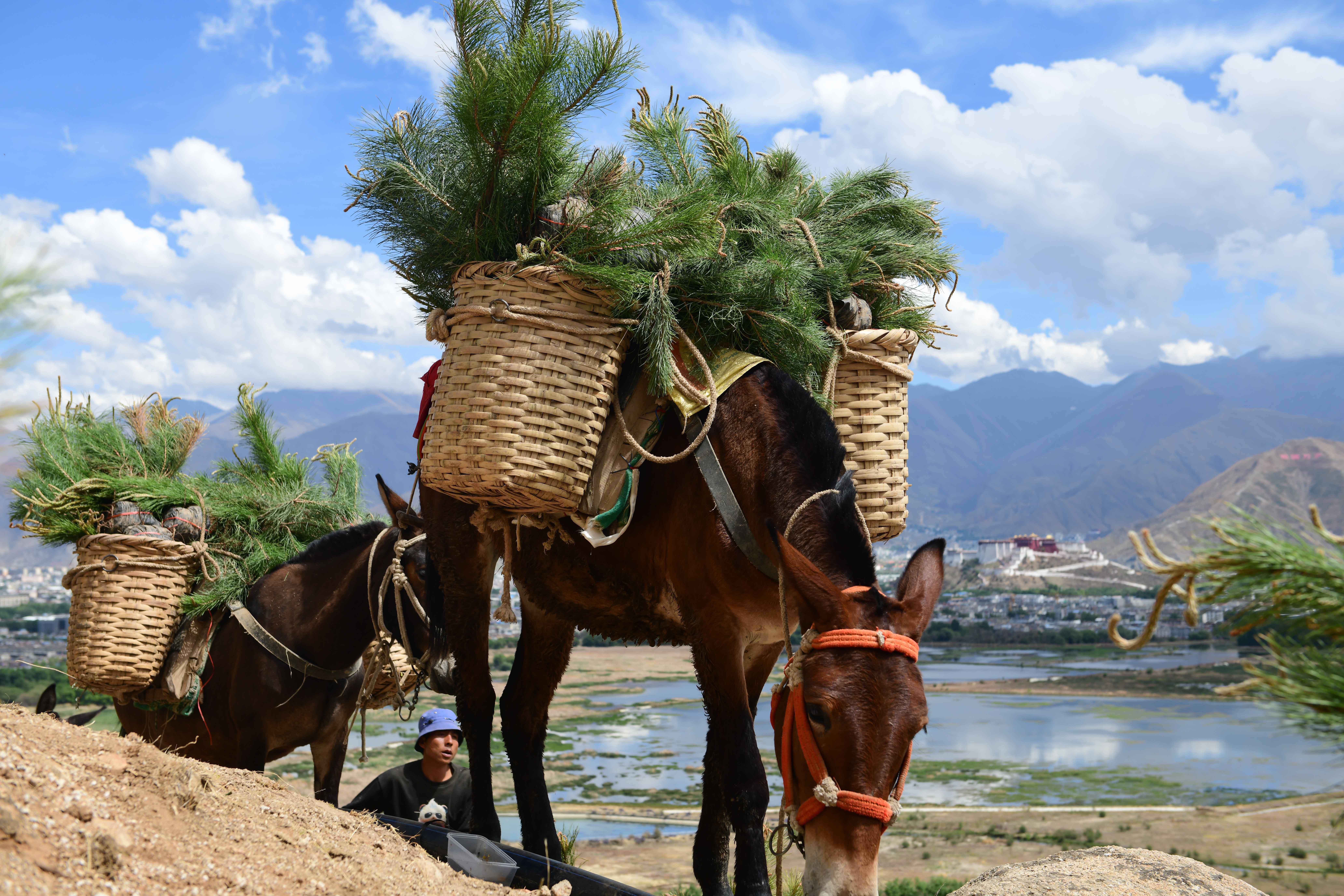 5月16日,西藏拉萨南北山绿化工程北山片区,造林队员利用骡子运送樟子松苗。(图片来源:中新社)