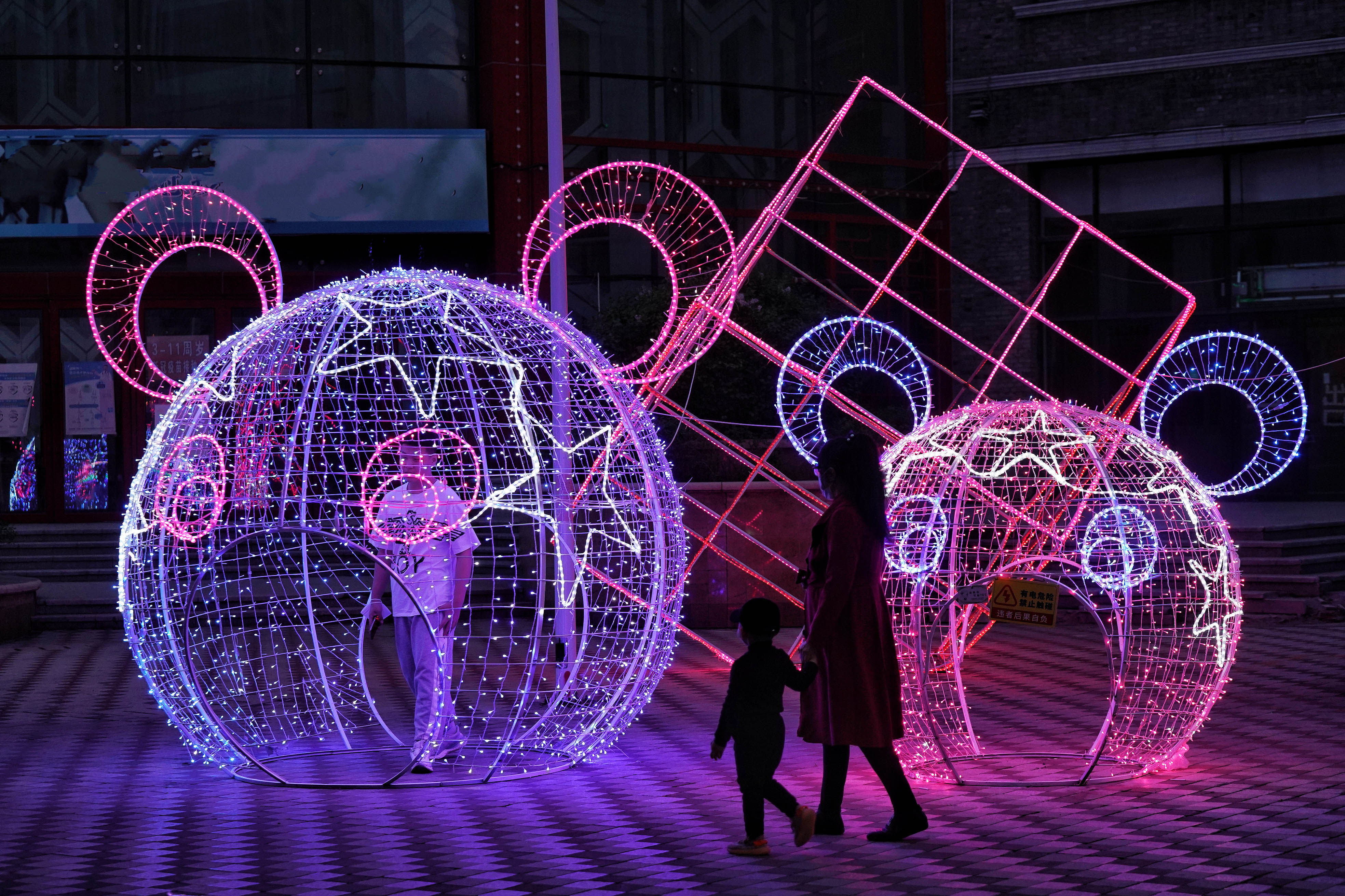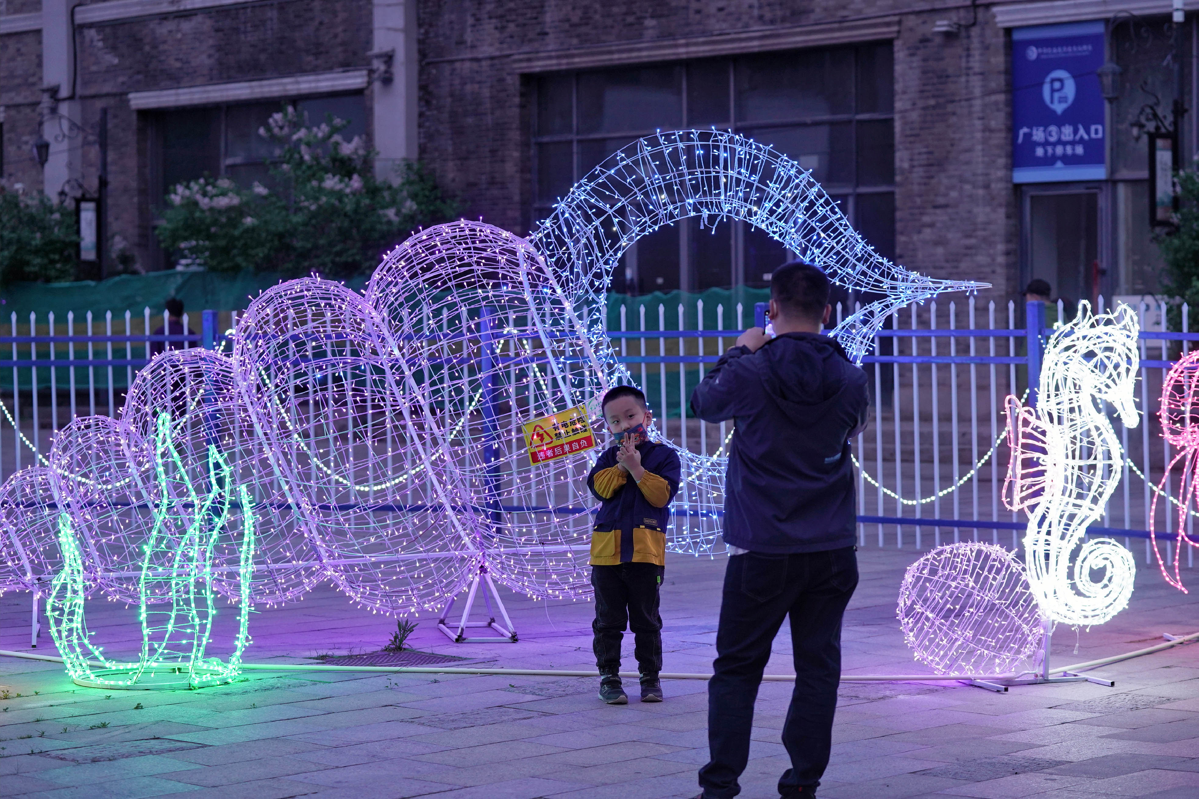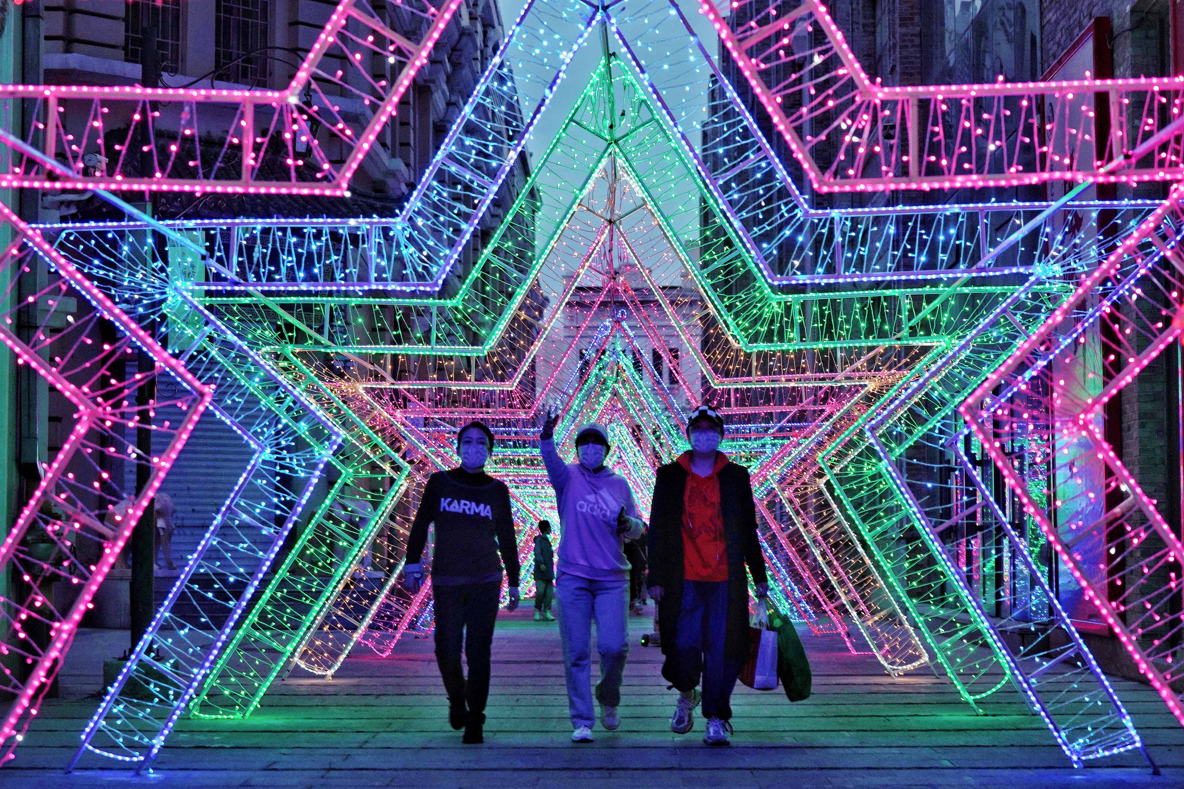 5月17日,黑龙江哈尔滨,市民在道外区中华巴洛克风情街上观赏灯光秀,多样的造型和灯光将街区装扮得非常美丽。(图片来源:中新社)