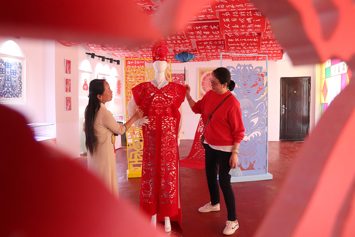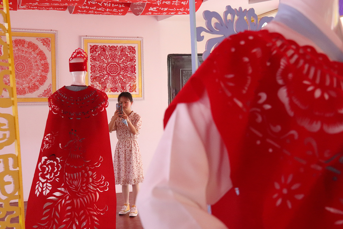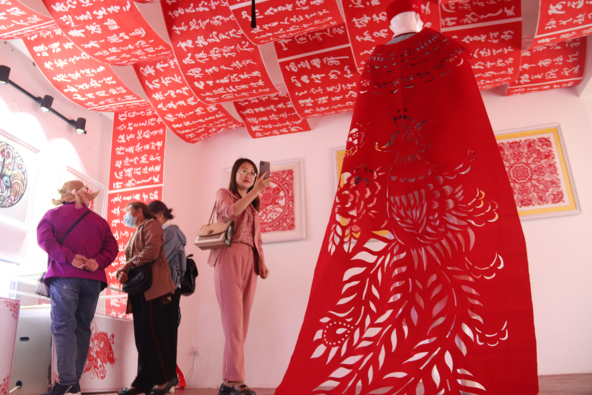 5月19日,甘肃省平凉市崆峒古镇“非遗一条街”赵娟剪纸展馆内,由平凉剪纸市级传承人赵娟创作的“剪纸衣”吸引参观者。2006年,平凉剪纸被列入第一批甘肃省非物质文化遗产保护名录。(图片来源:中新社)