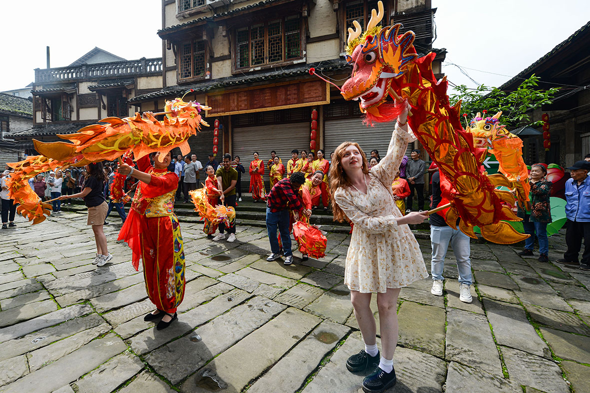 6月2日,来自重庆邮电大学的十余名外籍留学生在重庆市巴南区丰盛古镇体验包粽子和舞龙,观看非遗表演,提前过了一个充满地道中国味的端午节。图为外籍留学生体验舞龙。(图片来源:中新社)