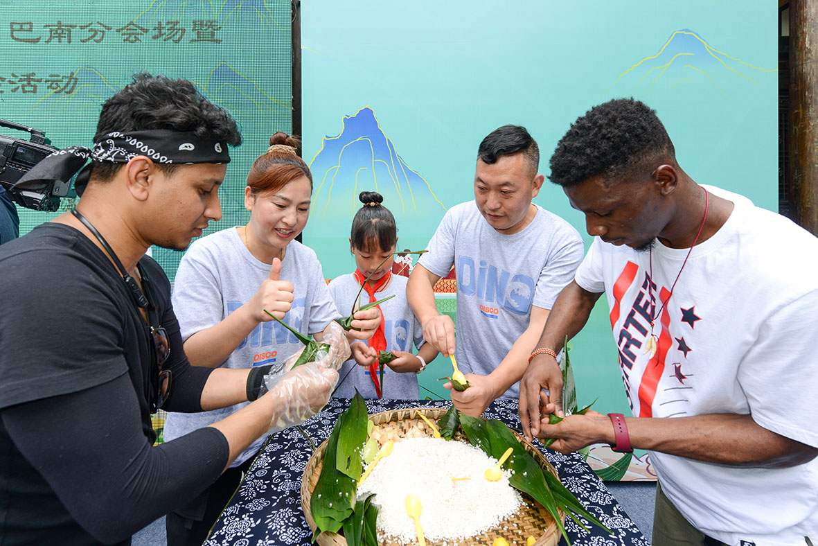 图为外籍留学生在丰盛古镇与当地居民一起包粽子、迎端午。(图片来源:中新社)