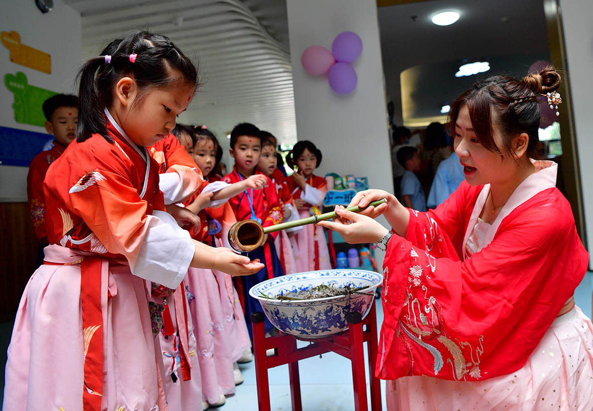 6月2日,福建福州,幼儿园小朋友在体验端午习俗,用沐兰汤洗手。当日,福州市仓山区娃娃培育中心举行传统民俗活动迎接端午节的到来。(图片来源:中新社)