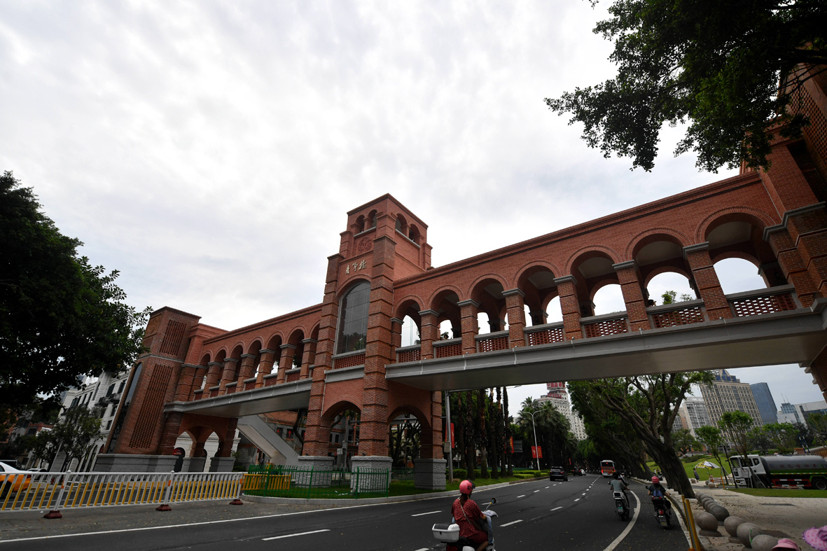 6月20日,福建福州,市民从青年桥下经过。青年桥是一座人行天桥,全长92米,桥宽4.2米。红砖塔楼、柱廊、窗花、“时间轴”等设计元素,为这座网红桥“锦上添花”,吸引许多市民、游客前来拍照打卡,也被称为“福州最美天桥”。 (图片来源:中新社)