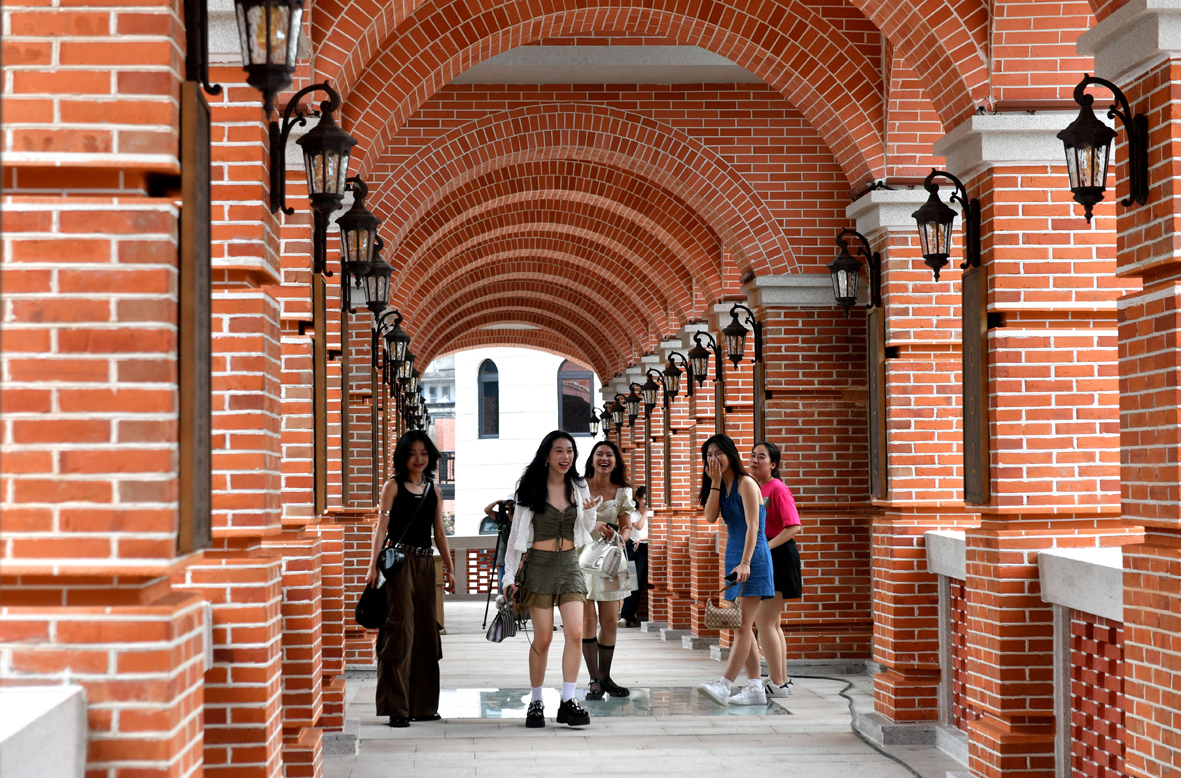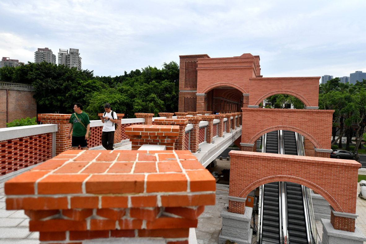 6月20日,福建福州,市民在青年桥上游览。青年桥是一座人行天桥,全长92米,桥宽4.2米。红砖塔楼、柱廊、窗花、“时间轴”等设计元素,为这座网红桥“锦上添花”,吸引许多市民、游客前来拍照打卡,也被称为“福州最美天桥”。 (图片来源:中新社)