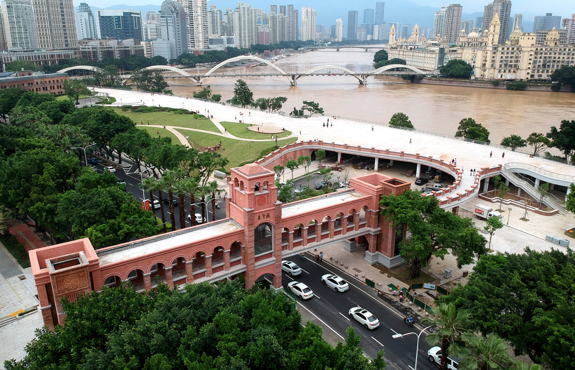 6月20日,福建福州,航拍青年桥。青年桥是一座人行天桥,全长92米,桥宽4.2米。红砖塔楼、柱廊、窗花、“时间轴”等设计元素,为这座网红桥“锦上添花”,吸引许多市民、游客前来拍照打卡,也被称为“福州最美天桥”。(无人机照片) (图片来源:中新社)