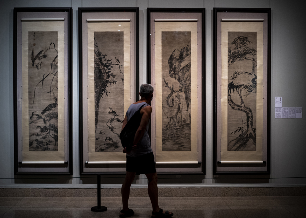 6月23日,观众在位于北京的中国美术馆内参观“斯文传古风——邓拓捐赠古代绘画精品展”,欣赏“八大山人”朱耷四条屏水墨《鹤鹿凫雁》。邓拓先生于1964年将自己收藏的145件古代绘画作品捐赠给中国美术馆,对于梳理中国美术史的发展意义重大。 (图片来源:中新社)