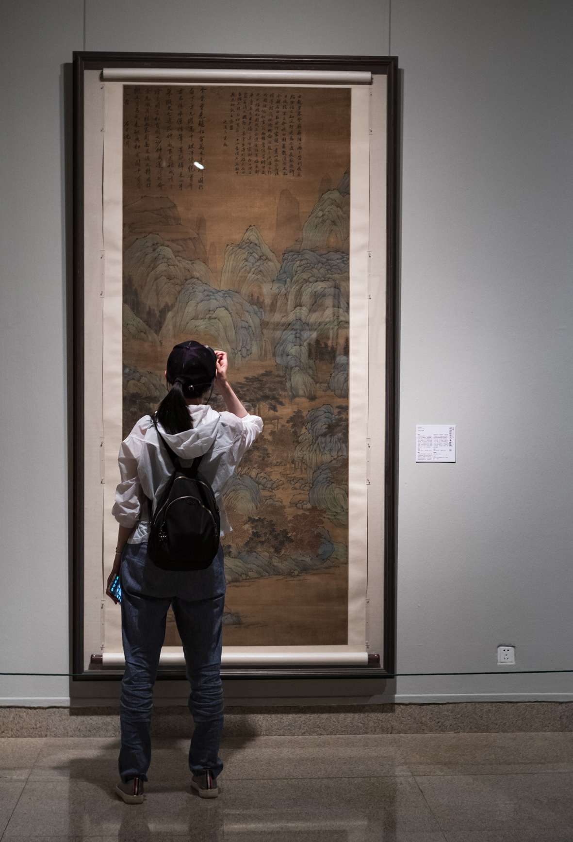 6月23日,观众在位于北京的中国美术馆内参观“斯文传古风——邓拓捐赠古代绘画精品展”,欣赏沈周作绢本设色《拟赵松雪万木峰图》。 (图片来源:中新社)